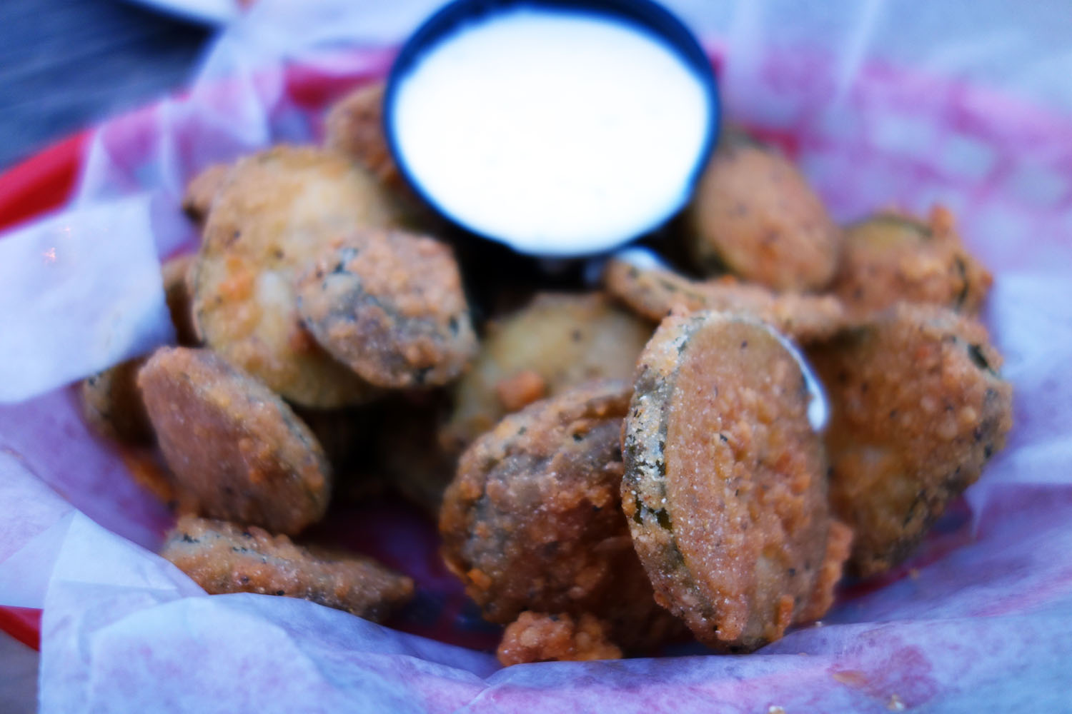 I’m talking about the Tabasco Fried Pickles served with ranch dipping sauce. The pickles had been sliced thin (which definitely beats fried pickles in wedge form) and marinated in tabasco to acquire a spice that survived the battering and frying process and came through in the finished bite, interlaced with the acidity of the pickle. The combination of the juicy, moist interior and the gritty, crunchy cornmeal batter exterior was great, though the ranch was a bit too thick in my opinion to dip into.
