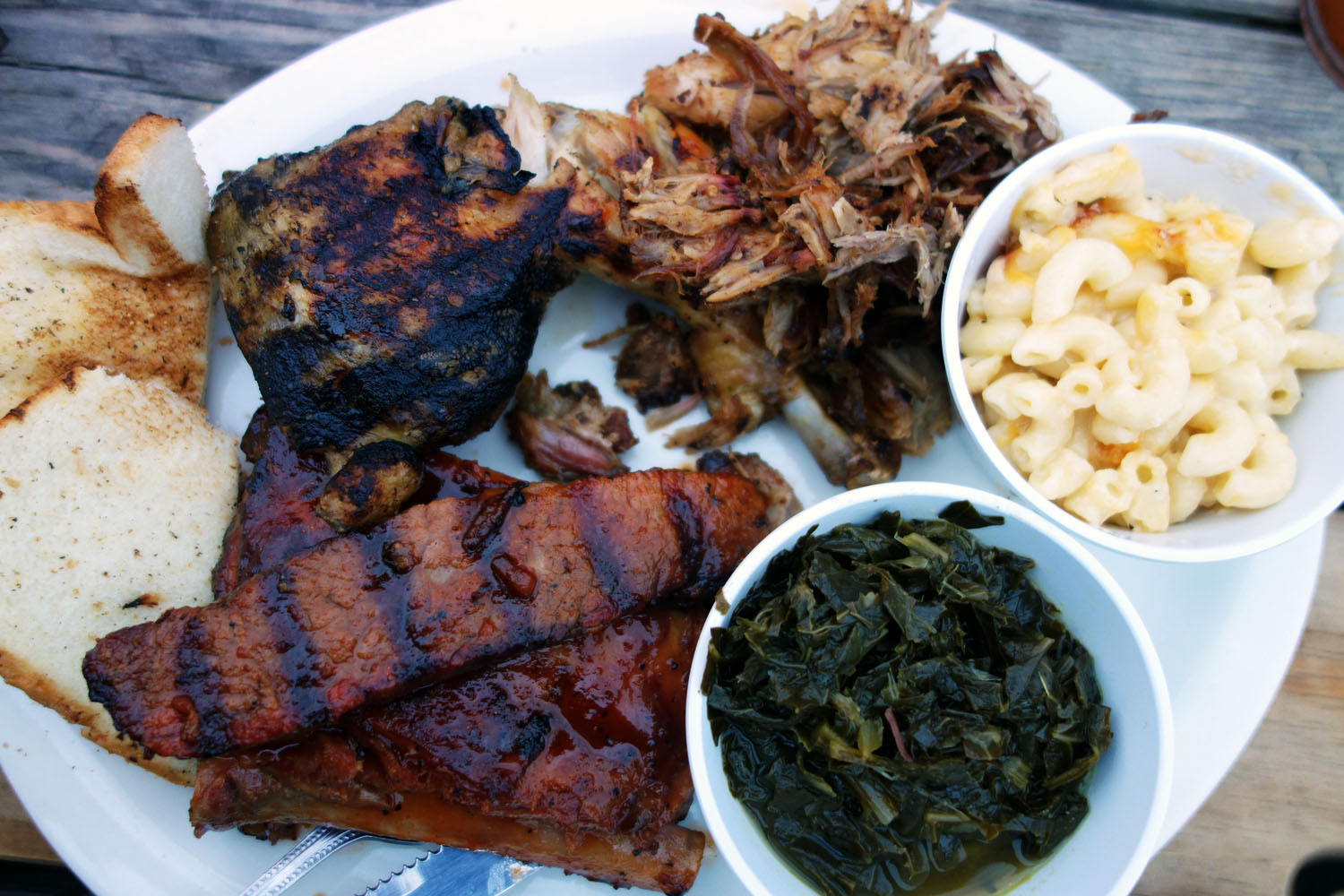The combo platter option gives you a choice of four meats while the “Sidecar” part of the menu makes trying out side dishes very easy and affordable…3 for $6, 4 for $8. I love restaurants that encourage variety. We chose the Pulled Pork, Beer Can Chicken, Brisket and Ribs with a side of collards and mac ‘n’ cheese. We also got a nice little appetizer to start out with as we had not eaten anything since Myrtle and were too hungry to wait out the platter. Unfortunately the appetizer got there after the main, but I guess it was fine as a side as well.