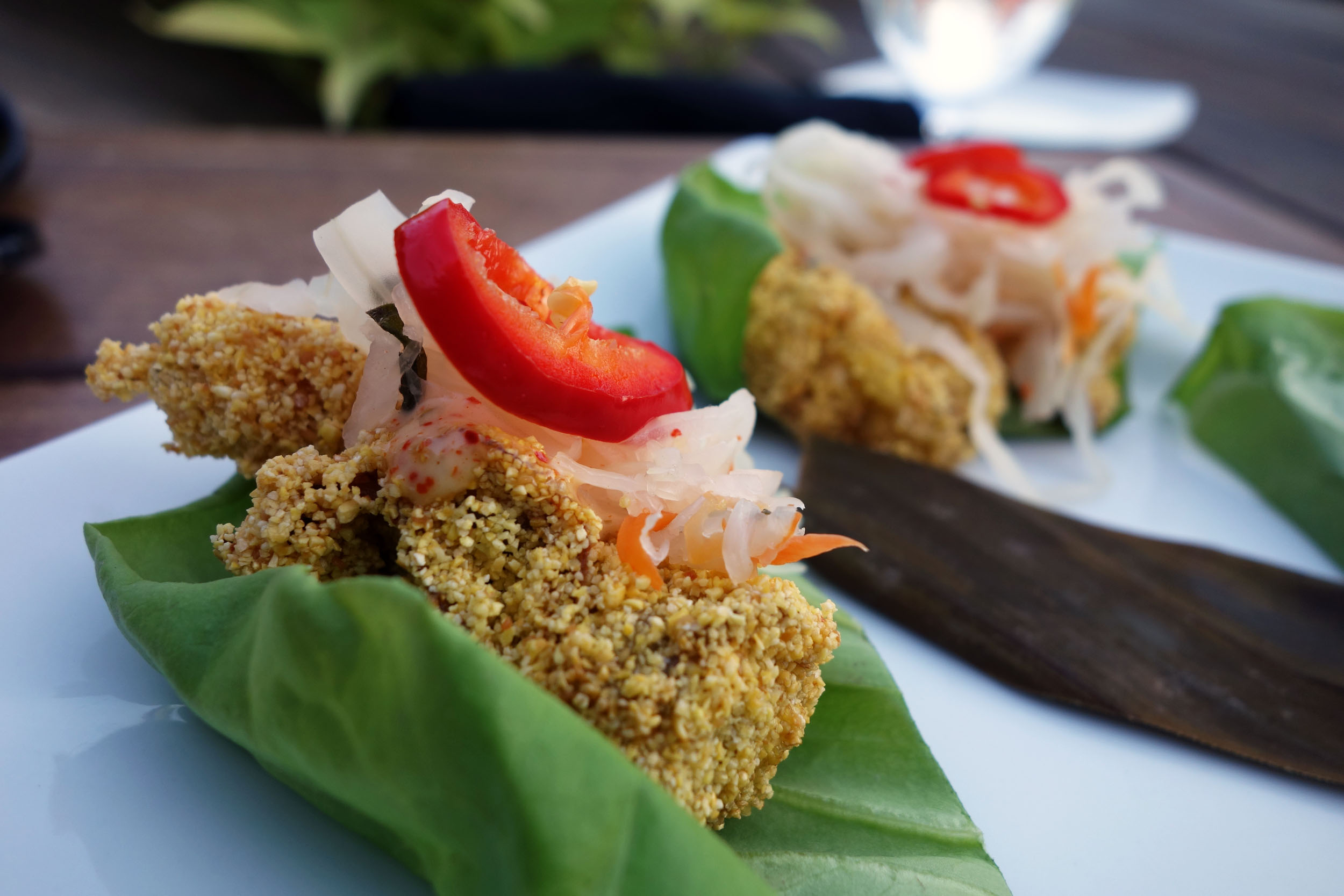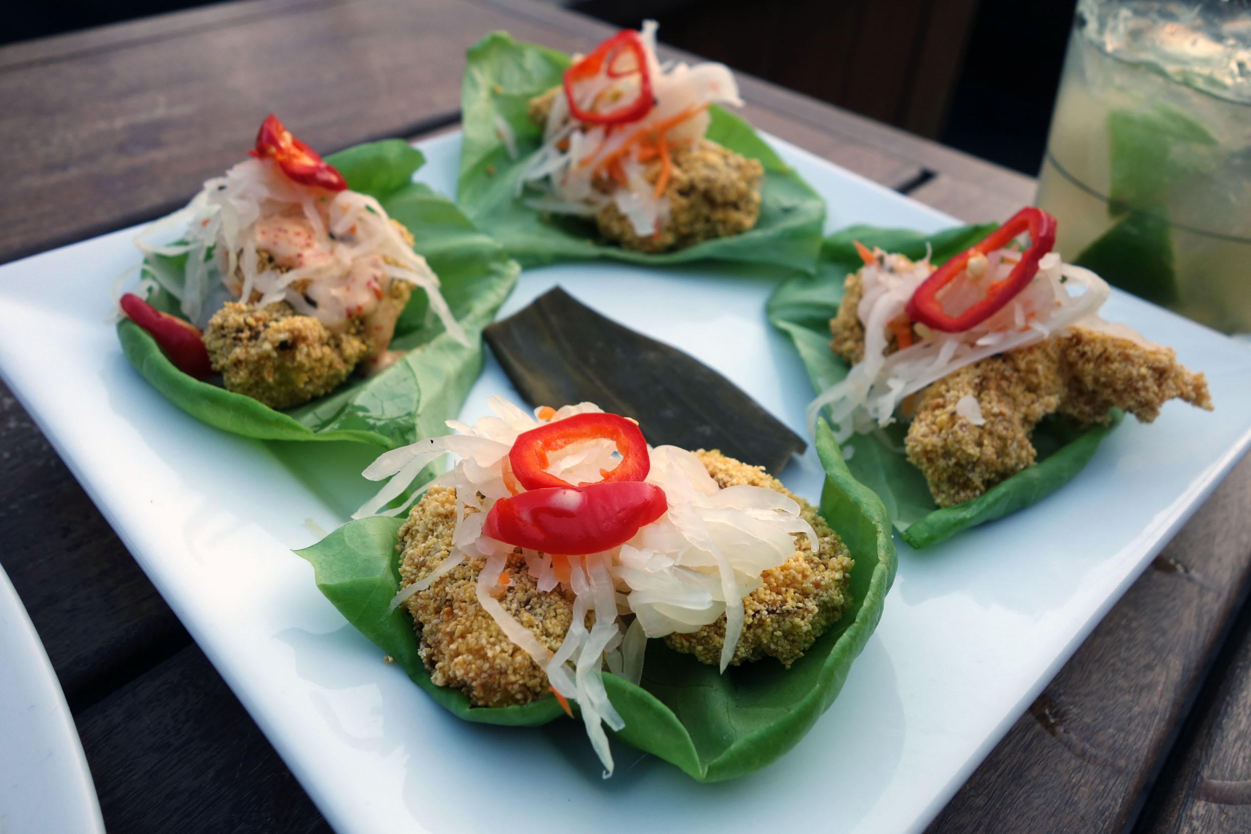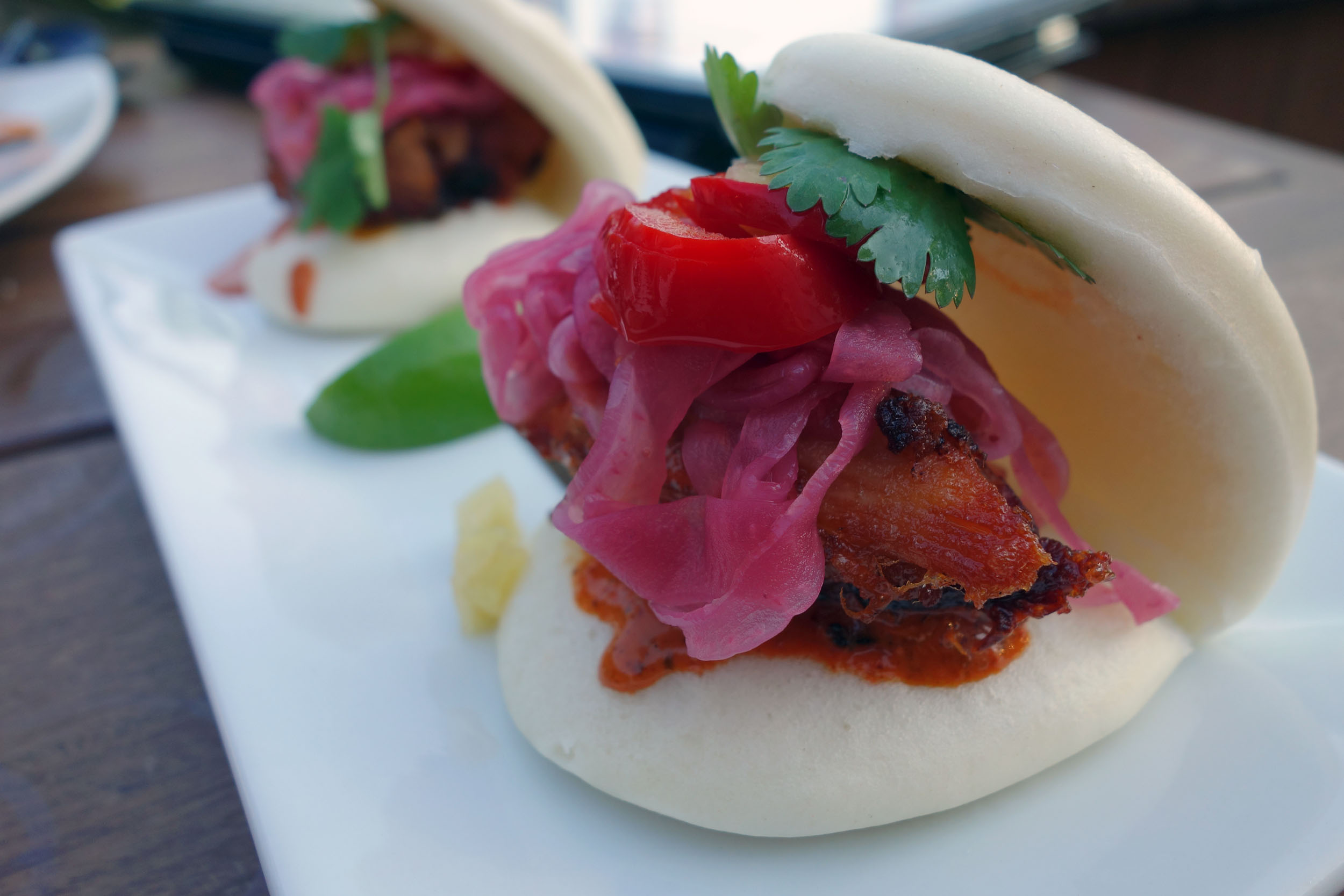 From the Meat & Poultry section of the menu, we ordered the Pork Belly Steamed Buns, which came out as single rectangular hunks of juicy pork belly marinated in hoisin, topped with a creamy, slightly spicy achiote sauce, some onion pickled in red wine vinegar, pickled red fresno peppers and, which was unexpectedly my favorite ingredient, small chunks of fresh pineapple. A visually striking dish, with bright, healthy colors that made my mouth water as I was taking photos. Although a little bit busy with ingredients, the flavors of the bao-stuffing harmonized well, with the onion perking up the deep herbal flavors of the achiote sauce, while the pineapple brought a sweet contrast that went well with the cloves and allspice in the achiote. The pickled pepper rings added some heat but not an overwhelming amount – this is not a spicy dish but a balanced one. The textures were all there as well, with the pillow soft, stick-to-the-teeth steamed bun wrapped around a hunky chunk of succulent meat and the veggies and fruit adding hydration and crunch. I’m not sure whether or not this was on purpose, but one of the pork belly pieces had more of a crispier, caramelized but drier thing going on, while the other was more juicy and fatty. I appreciated the experience of trying both textures.