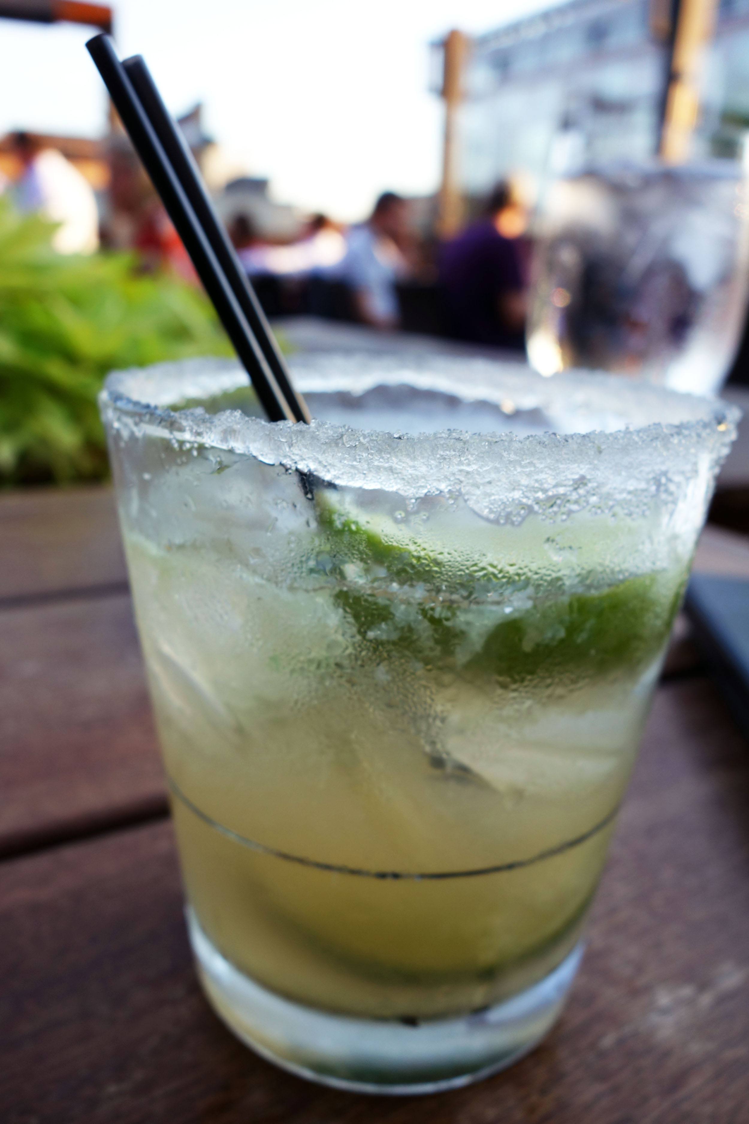 Needless to say, choosing only a few dishes is a bit of a challenge and what follows that initial silence is conversation about what to share, an ideal icebreaker topic. I don’t think anyone goes to Masa 14, glances at the menu and closes it, going “Yeah, I’ll have the Green Apple Curry Chicken.” What may help is picking out the drink first and matching something to that. Besides the great selection of seasoned margaritas, mojitos and caipis which match the rooftop scene perfectly, there are also some very nice tequilas, mescals and piscos along with the more popular gins and whiskeys. The wine program is humble but contains some great stuff, especially when it comes to whites by the bottle – two Argentine Torrontes’, New Zealand Sauv Blancs and Spanish Verdejos. On Mondays, all bottled wines come half priced with dinner, a fact which might explain why on the Monday my dinner companion and I went almost every table had a bottle of frosty white crisping up in ice. I got one of their signature drinks, the Spicy Cucumber Margarita, a blanco tequila infused [in house, I think] with cucumber and fresno peppers, a bit of agave and lime added. The drink was nice and green from the cucumber with a feint heat from the pepper infusion and only a very slight sweetness since agave was used to sweeten it instead of syrup. Not too exciting but delicate and light. After a few sips, ordering became easier.