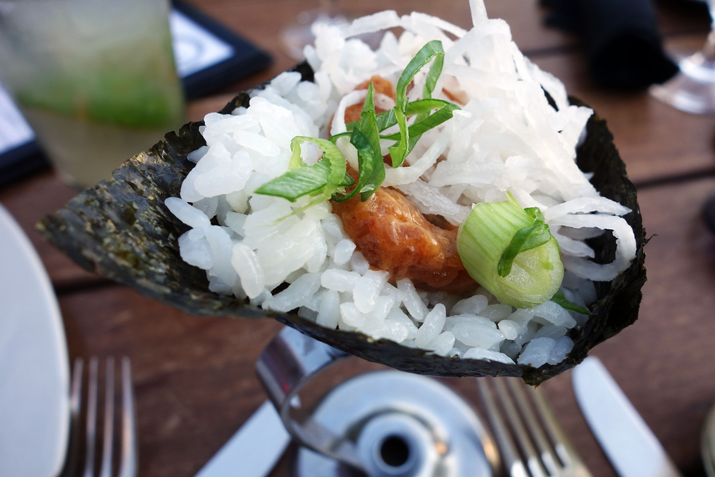 Upon the recommendation of our server, we started out with the Spicy Tuna Sushi Handroll, one of four temaki’s flagging the dinner menu as unofficial must-order appetizers. The roll came neatly stuffed into a graceful little metal ice cream cone holder, which reached up towards us and made the contents more visible. A mushy wad of very delicate spicy tuna was inserted into a cone of rice spotted here and there with wasabi and topped with crisp, hydrating jicama and scallions. Nice and simple, and about 3 times the size of a traditional handroll to make each bite more satisfying and to make it a shareable thing. Biting through the nori was relatively easy, though the seaweed stuck to my teeth a tiny bit. The tuna was a great texture and the ratio of fish to rice was spot on. The rice was cooked to a nice consistency, firm enough to stand up to the soft fish. Shreds of jicama added a bit of crunch and moisture to each bite, though I wouldn’t have minded these being seasoned more, perhaps marinated in the wasabi which was incorporated in an uneven way through the dish. I did really enjoy the fact that the bottom of the cone contained a nice little heap of wasabi as it woke up my senses, cleared my palate and got me ready for the following courses. It was also a clever little nod to the chocolate Drumstick ice cream cones with chocolate in the tip.
