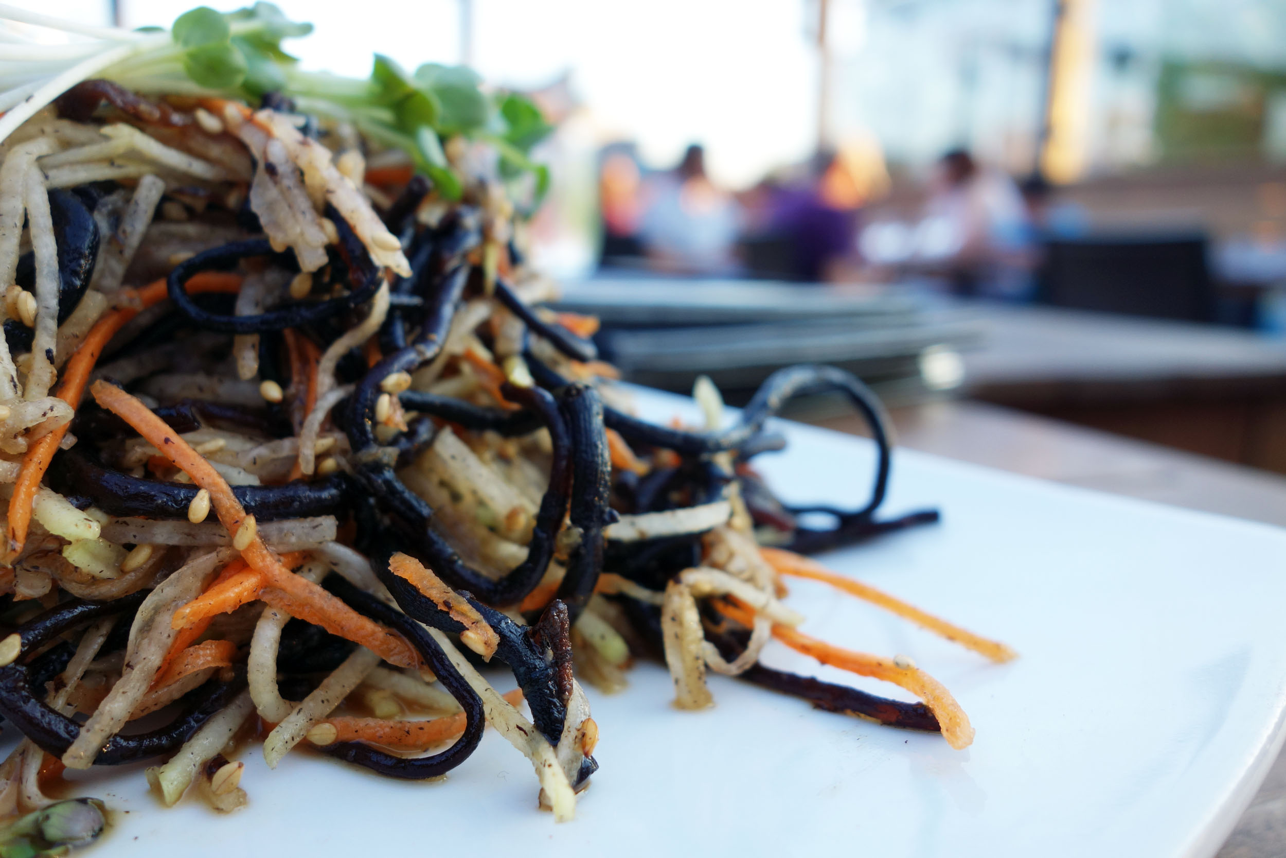 The menu at Masa 14 is one that brings a moment of thoughtful silence over the table. Chatter is temporarily halted by the wild array of dishes crafted by Executive Chefs Richard Sandoval, Kaz Okochi and Adam Goldman, small-plate treats that fuse South American flavor with Asian preparation. There are Japanese temaki rolls accented with jalapeño and jicama. There are light soups and salads, as well as veggie sides such as fried yucca and kimchi brussel sprouts. A selection of light, sundress-friendly flatbreads is followed by heartier Carne Noodles and Shrimp and Bulgogi Fried Rice. A shrimp, octopus and scallop ceviche and a Spicy Crunchy Salmon Chirashi Bowl constitute the raw portion of the menu. But it doesn’t stop there. The menu continues with a meat and poultry section which offers everything from crispy Japanese-style chicken wings to grilled tenderloin steak to meatballs in a tomato-yuzu sauce. Octopus, crab, shrimp, calamari, oysters and mussels all appear on the seafood section along with a chipotle miso black cod and a hoisin glazed salmon…