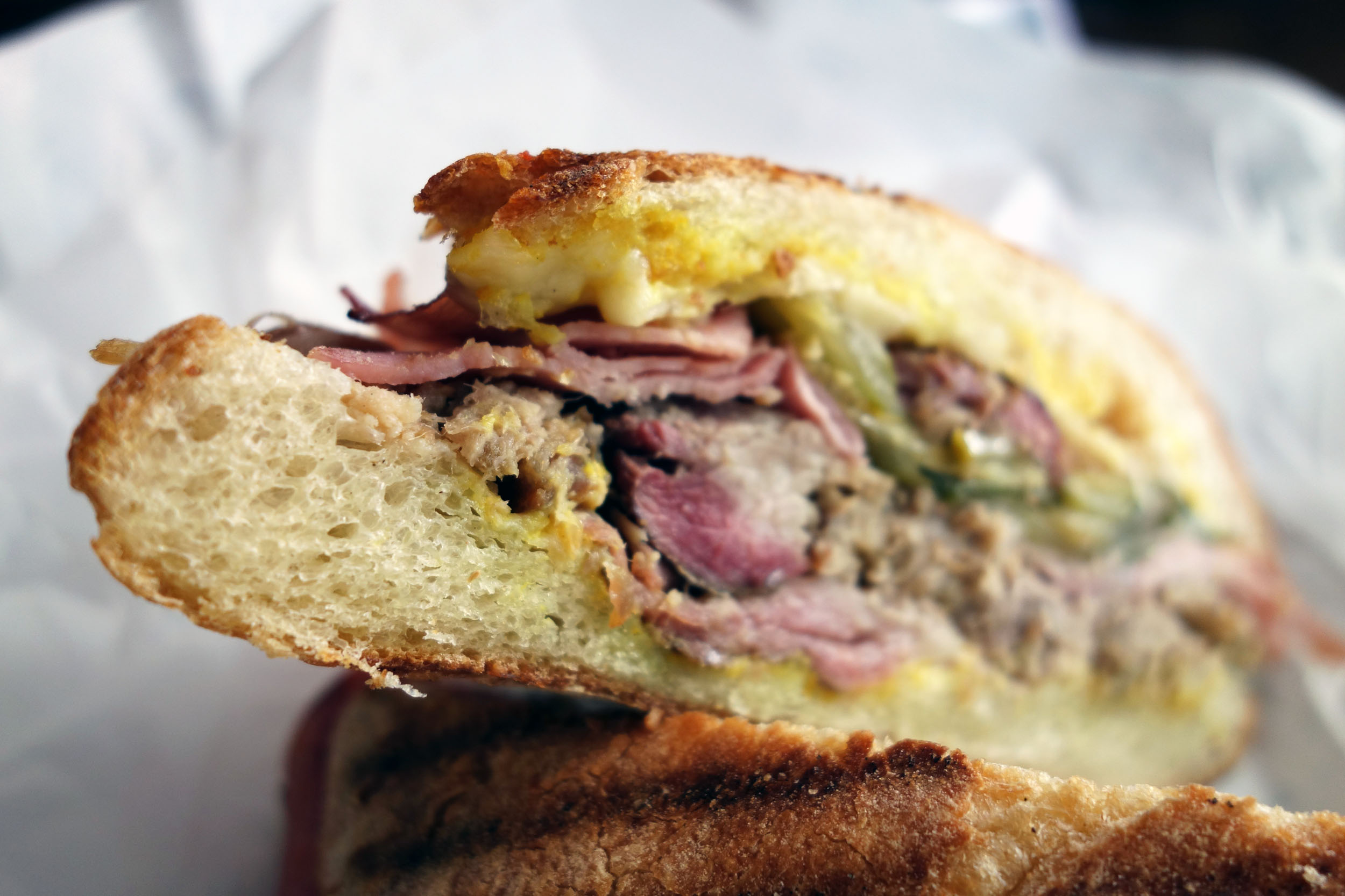 One of my favorite sandwiches is one my boyfriend happened to order our first time there, the Miró-ian, pressed Cubano Panino. I liked about this Cuban sandie that it wasn’t too far from the classic, remaining true to the most widely know definition of a Cuban sandwich. The two preparations of pork in this case were a succulent roasted pork collar and a salty, slightly lighter prosciutto cotto (Italian for “ham”). The cheese was Swiss, true to custom. There was also a smear of tangy, spicy yellow mustard and crispy, acidic hella-refreshing wonderful, fantastic pickles. The flavors of the two meats went together well and the cheese melted just enough to glue the bread to the rest of the ingredients. There was just enough Swiss to give the sandwich a nutty flavor. The pickles were spread out into a smooth, crunchy layer, adding a great bite and hydrating the sandwich with its briny jus. I was very impressed by the quality of the bread as well, pressed to a toasty, crunchy consistency and in perfect ratio to the filling. It was crisp without being dry and seemed to hold out well against the moisture within, making it a perfect sandwich to take to go as well. I heard around town that Isabella was planning to sneak a few bits of chicharron into these sandwiches to give them an extra hint of crunch and juicy fat and salt. I don’t remember any chicharron in my bites but it easily could’ve been in other patches of the sandwich and if so, it’s an addition I support.