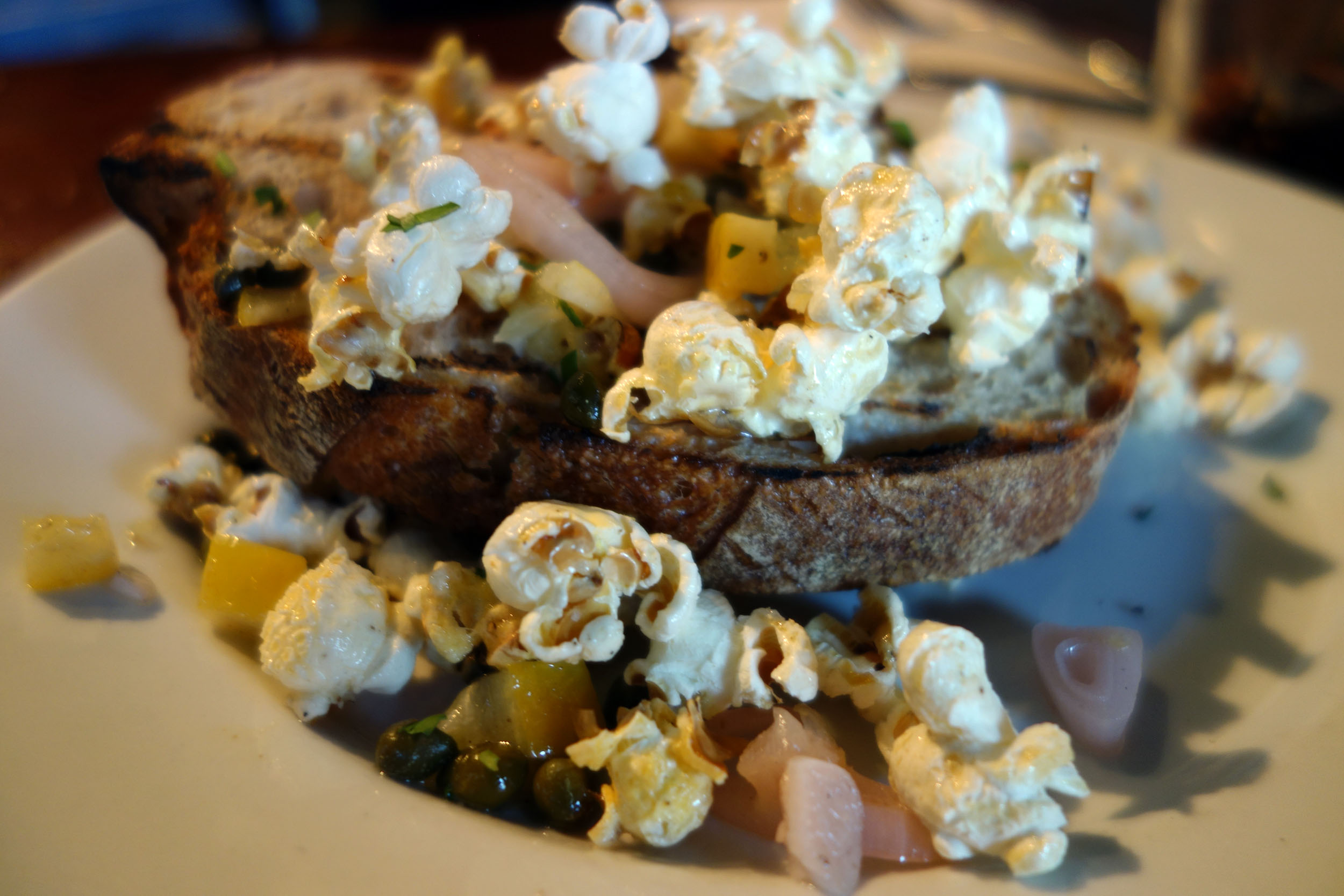 Next up we ordered something that we thought had potential but turned out to be one of the weirdest (not in a good way) dishes I’ve had to date. It was called on the menu “Whipped Bone Marrow on Toast, Capers, Shallot, Popcorn” and was an amalgamation of just those things – a thick slice of wheat toast (otherwise quite delicious) smeared with a very scant layer of whipped bone marrow and then some sauteed shallots, capers, chunks of rind-on lemon and a large amount of popcorn thrown, as if angrily, over the top. The whole thing kind of seemed like a practical joke. “Oh you want bone marrow? Aren’t we fancy? Well guess what – you’re getting a plate full of random stuff that have nothing to do with one another. That’ll teach you to just order the sliders next time, like a normal person.” Even if there had been enough of the bone marrow to actually taste its meaty butteriness, the painfully acidic and bitter lemon chunks, egged on by the tart capers, would’ve completely overpowered its subtle flavors. The popcorn made the dish awkward to eat while contributing nothing in terms of either flavor or texture, drying out the toast even more with its own dry, powdery feel. The shallots lay there limp, confused on what their role was to be. An attempt to think outside the box, but this one just got too far away from the box altogether.