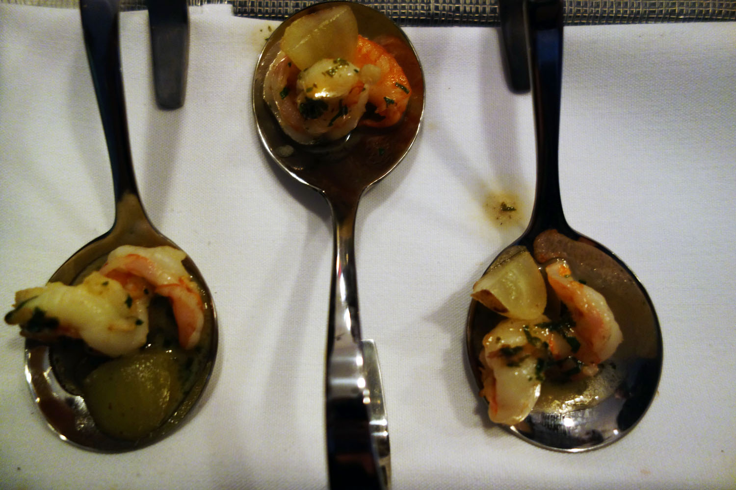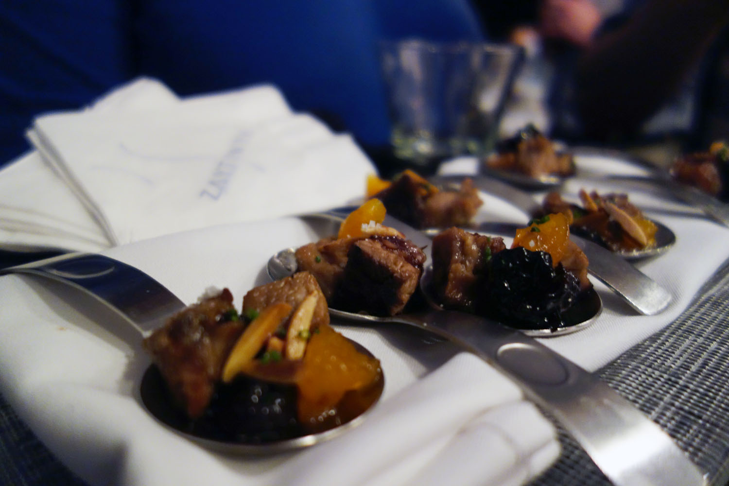 Our first bite was the Garides Me Ouzo (or was it Garides Me Raki?) which had baby shrimp flamed in anise-scented raki, a Lebanese liquor quite similar in its flavor profile to ouzo. For a minute I thought I heard they were infused with rakia which, as a proud Eastern European chick, I am quite fond of. I wasn’t too happy when I found out the flambé-juice was actually something from the licorice-flavored-booze category, as I also belong to the category of folks who simply cannot stand anise. I understand why other’s would love it; it’s an acquired taste like uni or Époisses or brains – all of which I adore! But alas – no absinthe, pastis, or sambuca for me! Luckily, most of the anise flavor had either been burned off along with the booze or was simply overpowered by the tart lemon juice pooling at the bottom. There was a bit too much of the latter in the first two bites of the shrimp I had, but the citrus flavor became slightly less potent by the end of the event, which lead me to believe that the kitchen had been alerted at some point and cooled it with the lemons, evening them out a bit with the rich shrimp stock and melted buttah that was also on the spoon. Yay for checks and balances! Sprinkled over the shrimp was also some aromatic tarragon and fresh chive, which pushed the shrimp into a zesty, savory direction. The grapes on this spoon were roasted and warm, adding a caramelized sweetness to counterbalance the lemon instead of just putting in more acidity. A deceptively complex little dish and a good way to show off the versatility off a not-so-common use of grape.