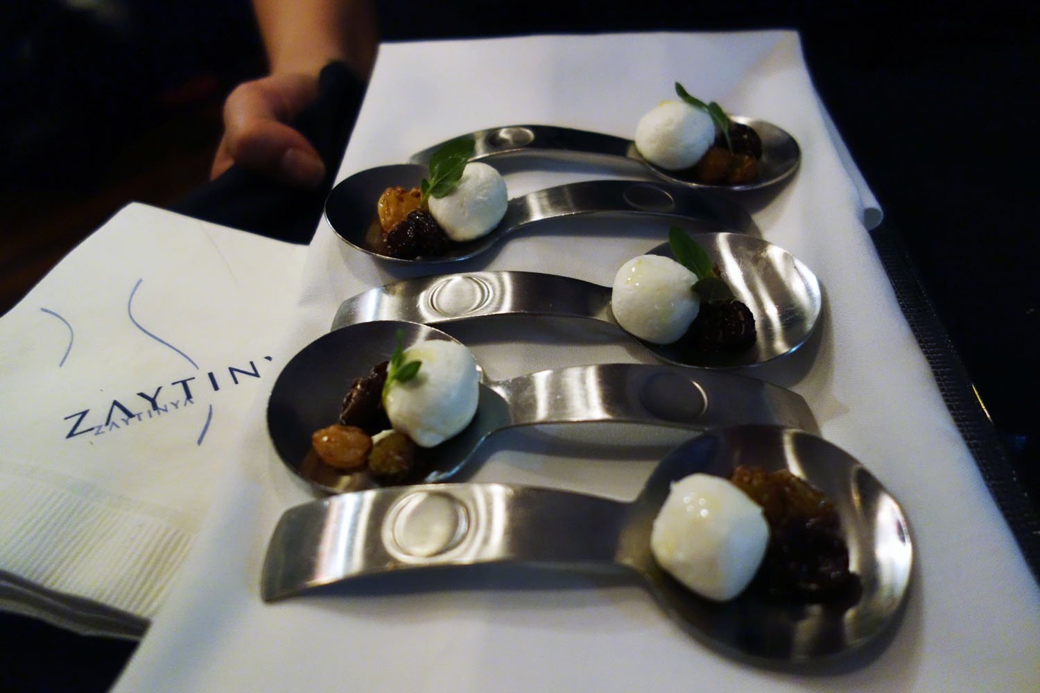 My hands-down favorite snack was the Lebanese-Style Preserved Labne, an airy, fluffy and mind-blowingly creamy ball of muslin-strained cow’s milk yoghurt, served with juicy little golden grape beads and raisins flavored with sticky sweet molasses. The deep, earthy, dirty sweetness of the dark molasses was contrasted perfectly by the clean, refreshing acidity of the snow-white labne. A bit of olive oil drizzled over the latter added a floral note, while the juice bursting forth from the fruit took the acidity of the labne in a sweet direction. As I learned, this was an example of a Greek/Middle Eastern “spoon sweet”, which is classically a spoon of sticky fruit preserves served with tea as a gesture of hospitality in Greece and the Middle East. Not even close to being satisfied by just one of these, I very much appreciated the kitchen sending out an extra tray.