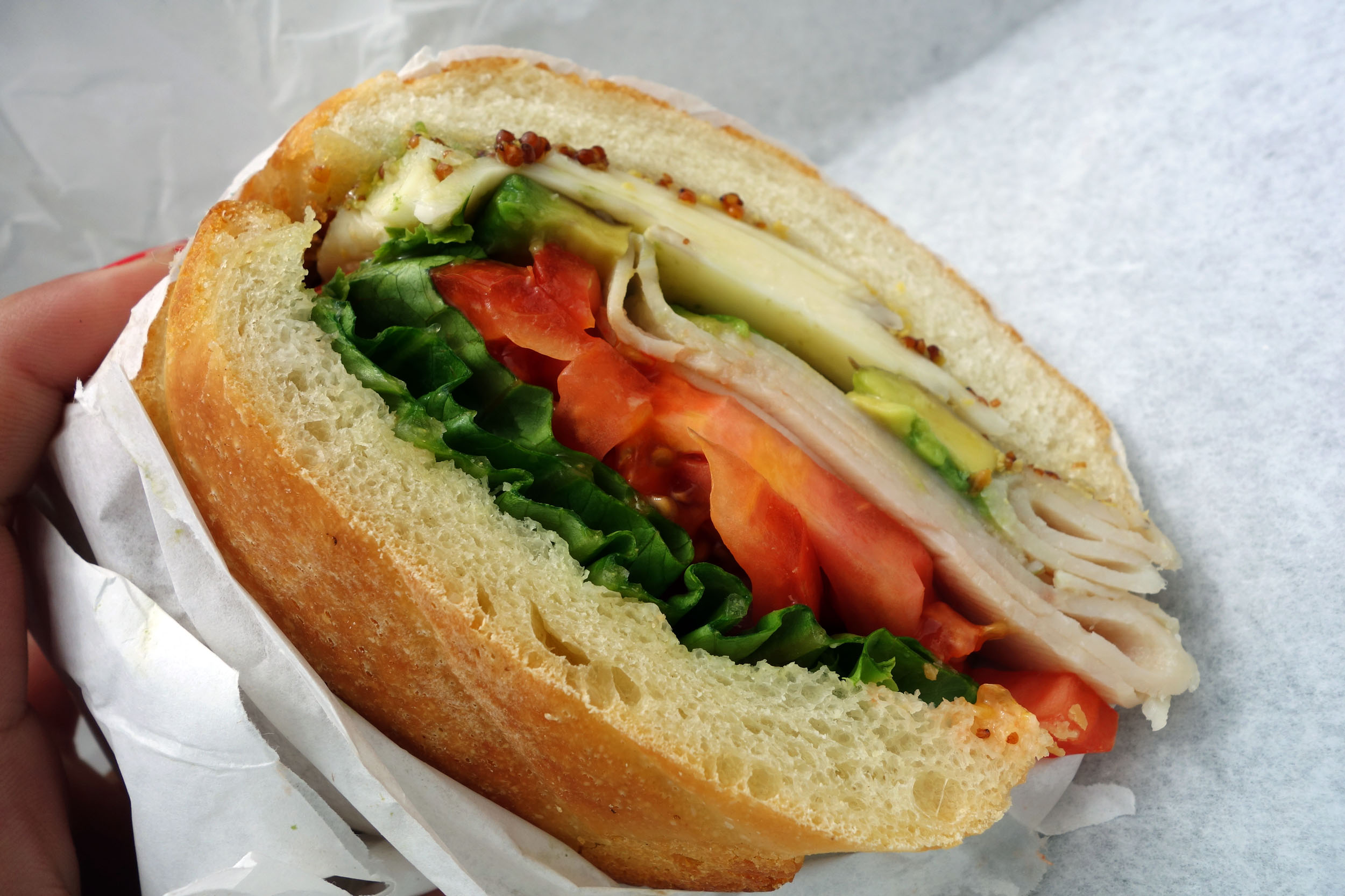 I think my sandwich was called The Californian (or something like that) and it had thick slices of turkey curled up with hearty chunks of very ripe avocado, jack cheese, fresh tomatoes, lettuce and a nice, thick layer of whole grain honey-mustard on crunchy, chewy French bread. Normally I’m not a huge fan of turkey and I prefer my sandwiches pressed or toasted. But in this case those rules did not apply. The turkey was fresh and did not have that slimy film of liquid on its surface. The avocados and tomatoes stayed fresh and cool with the sandwich staying a cold one and the jack cheese retained its springy texture along with its sharp taste instead of melting and bleeding out its delicious grease. The honey mustard was awesome, adding tons of flavor, a floral heat, to every bite.