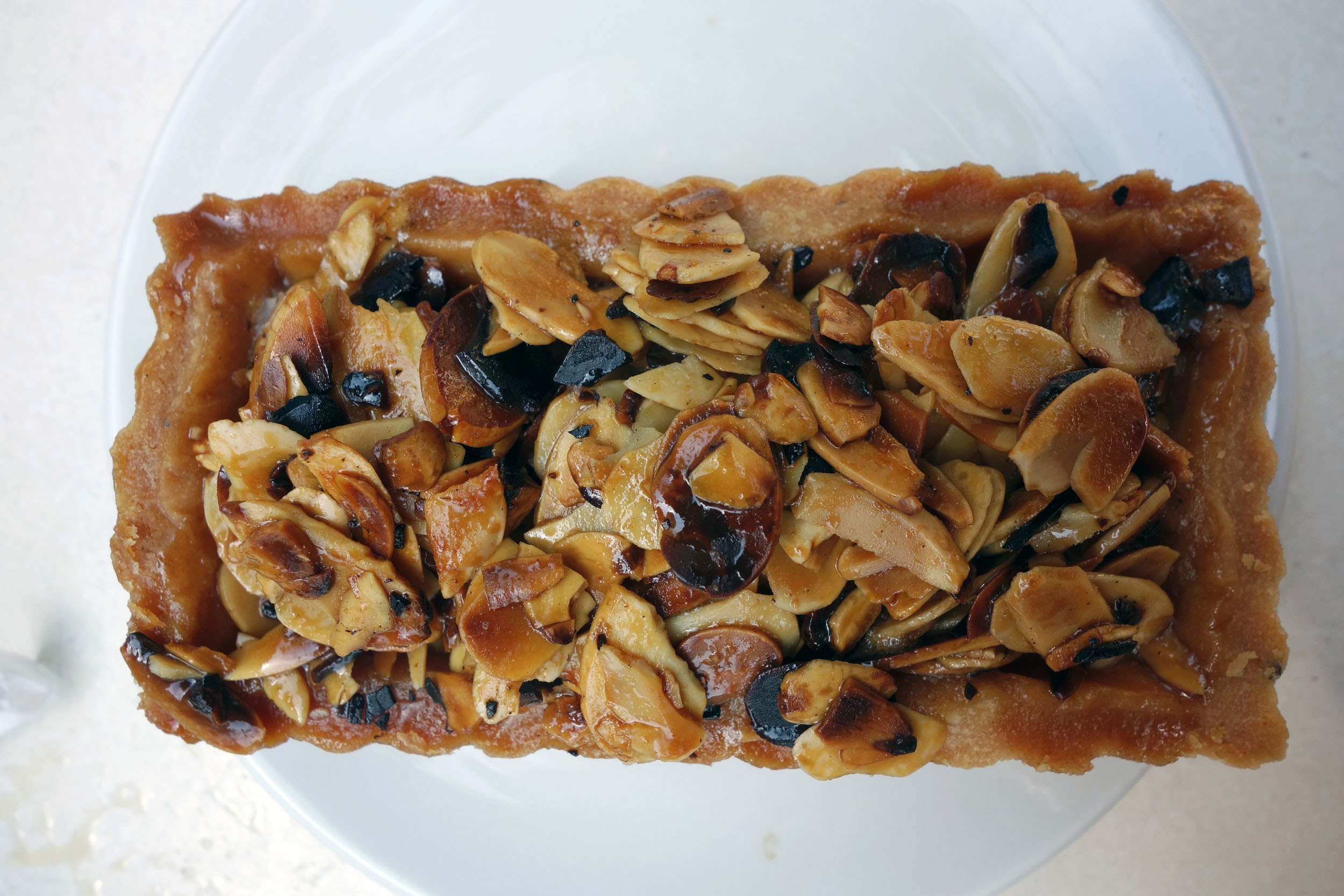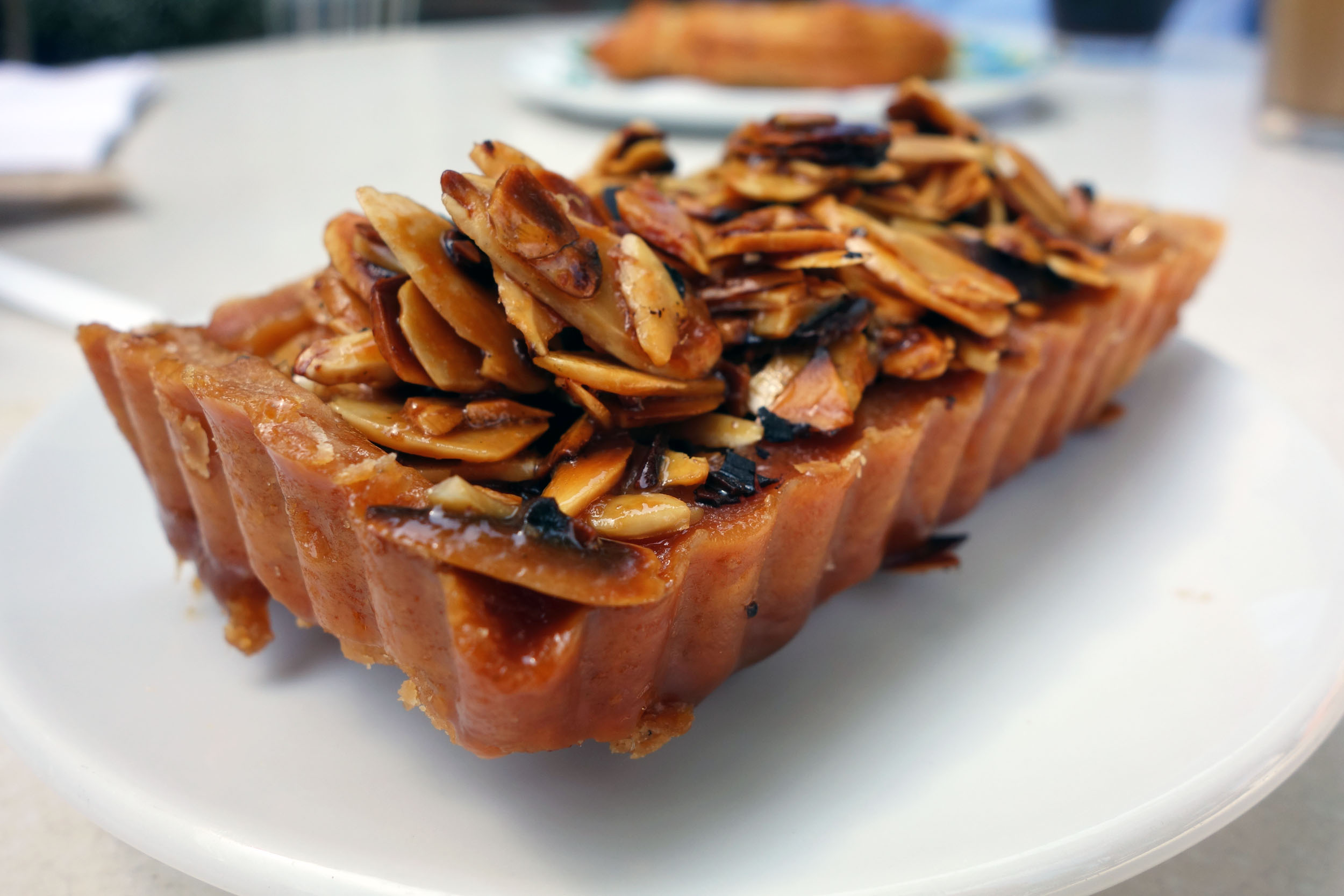 We ended our meal with one of Tatte’s signature Nut Boxes, the almond one specifically. A thick, buttery pie-shell type dough formed into a rectangle and neatly crimped along the sides. This was filled with a gooey, sweet caramel and topped with a heap of slivered almonds which had toasted to achieved smokey flavor. Here again, the proportions were a tad off for my taste with the pie shell being too thick for such a tiny bite. It was undeniably delicious, but a bit tough to bite through in order to get to the nuts. The almonds were also not as crispy as I had expected them to be, perhaps because the caramel added too much moisture to them during the baking process. Maybe a slice of one of the larger nut boxes are the way to go with this signature, so as to not run into the “thickened dough at the corners” problem again.