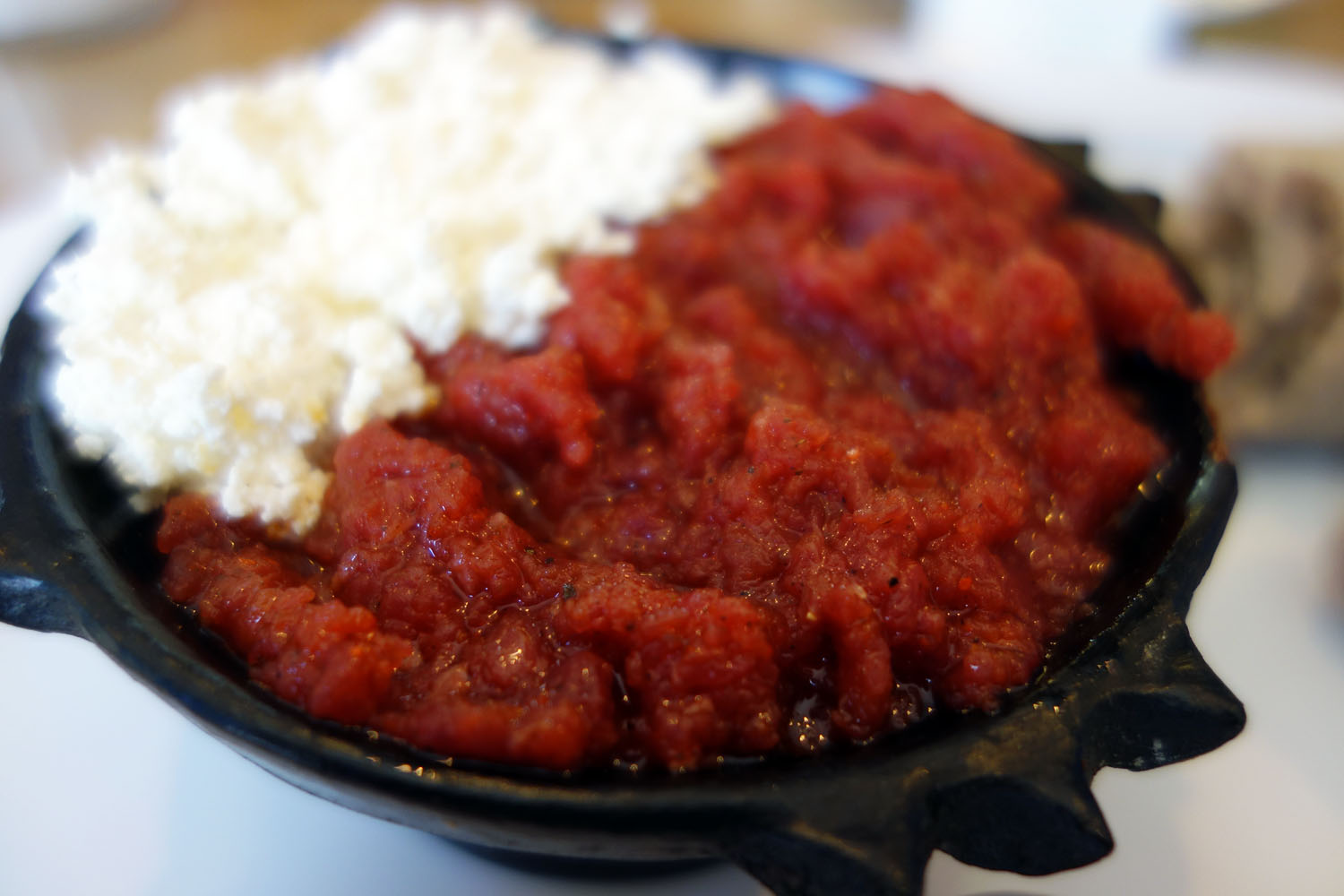 When I heard that Yetenbi is also well-known for its fabulous rendition of Ethiopia’s national dish, I needed to try this as well. What came out was a small cast iron dish filled half-way with Kitfo, which is minced raw beef marinated in mimita spice and nitter kibbeh. The other half was taken up by tangy, crumbly ayiba cheese curds. The dish came with warm injera to scoop with. Although I was initially surprised and off-put by the fact that the meat was slightly warm, unlike other beef tartares I have sampled in the past, I ended up enjoying kitfo immensely. The fresh meat picked up the variety of flavors of the niter kibbeh, which also softened it and added some very tasty grease for the injera to soak up. The heat from the African birdseye chile in the mimita spice kicked things up a bit while cardamom and clove added a very feint hint of autumnal comfort. The ayiba was a perfect pairing with the meat, its pungent acidity, similar to that of feta, soothed the spicy flavors of the kitfo. It was also quite a beautiful juxtaposition of colors. I must admit, having bleeding raw beef and strained cottage cheese right next to creamy tiramisu was a bit odd. But I guess so is the colonial history of Ethiopia…