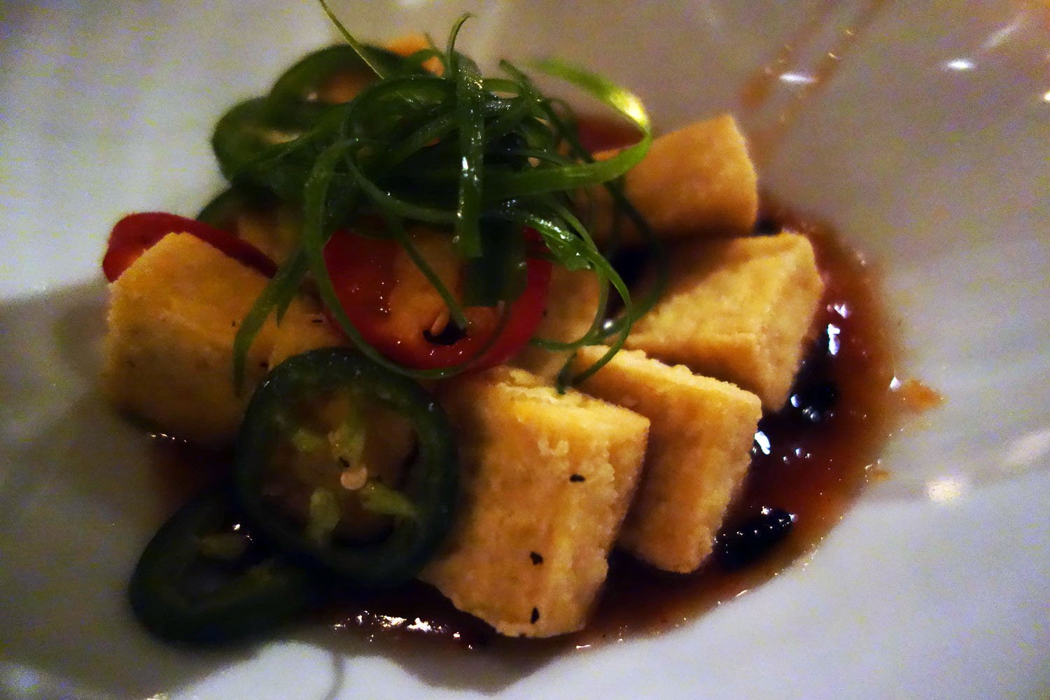 My personal favorite dish was perhaps the Crispy Tofu served with a black bean and sweet chili sauce, garnished with a bit of seaweed and slices of jalapeño. The chili sauce was a good thickness, tart and sweet with a bit of heat from the chili, reinforced by the slices of seed-in jalapeño. Little bumps of fermented black soybean added textural intrigue and a deep, murky, very salty flavor to the sauce. The tofu was crispy, fried to a golden brown perfection. I had worried that they would turn chewy but they retained a great crunch, maybe because the stuff was coated with some kind of batter. The tofu, of course, didn’t have much flavor on its own, but soaked up all the great sweetness, acidity and heat of the sauce. The seaweed garnish didn’t add much but looked pretty. A very well executed dish.