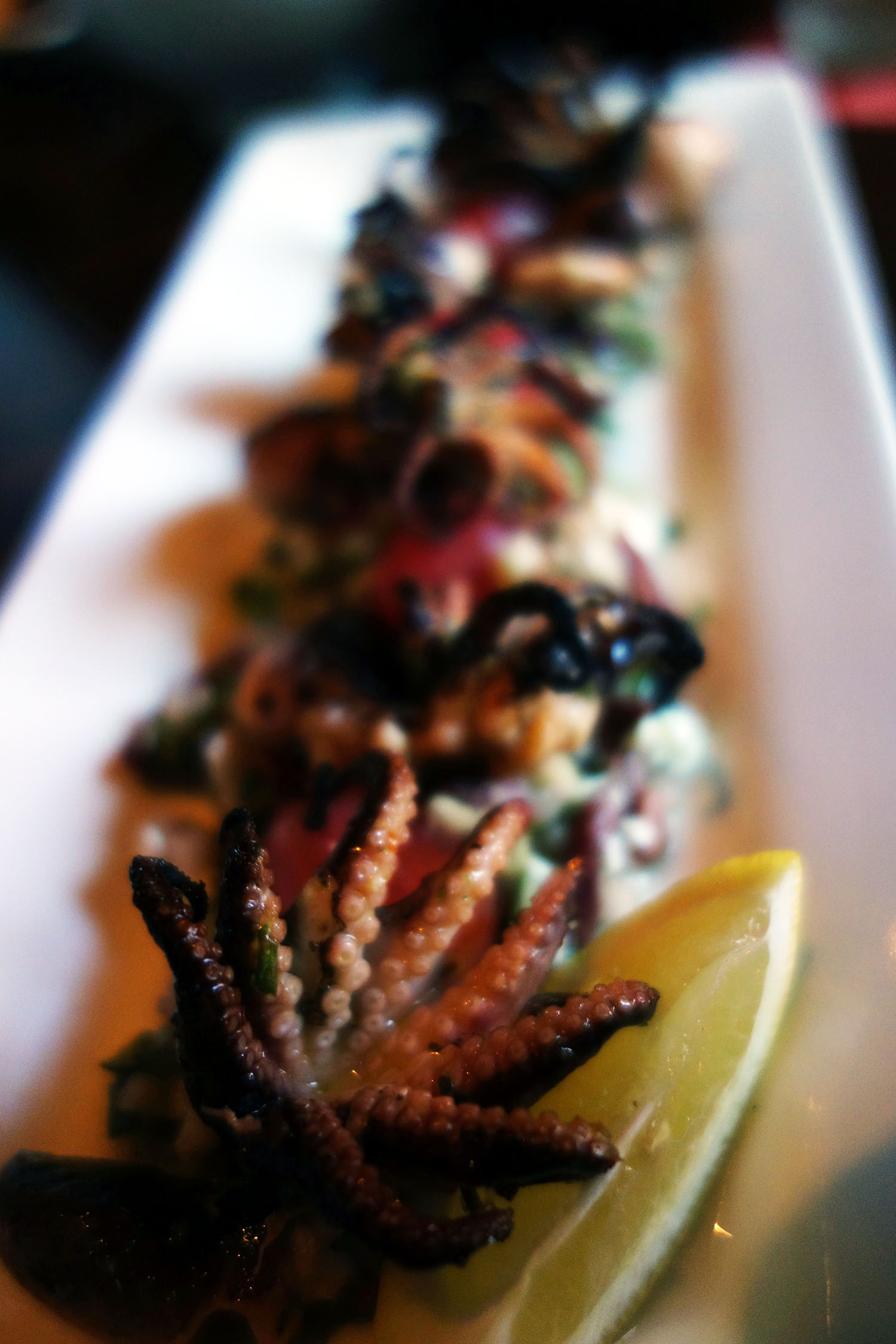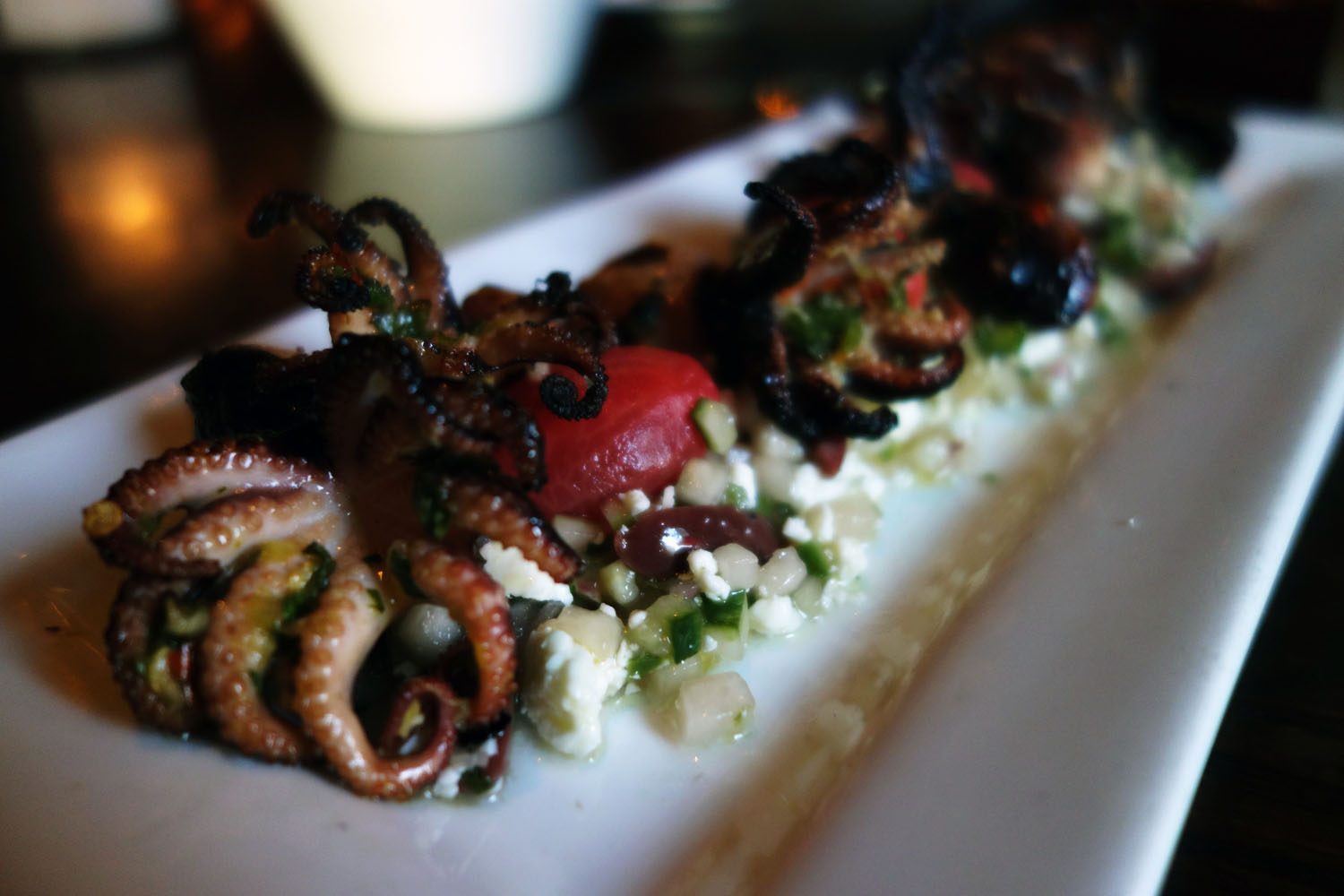 One of our most dazzling dishes was the Grilled Baby Octopus. The menu says it was marinated in citrus and truffle, but I think this may be outdated since I (thankfully!) didn’t taste too much truffle oil. The citrus was there though, along with heat from some chili powder – perhaps cayenne. Flavorwise the dish was dominated by the colorful little Greek salad serving as the bed for the baby octopi to sit on. A fine micro-chop of cucumber, some tangy, crumbly, feta-type cow’s milk cheese, a few slices of purple kalamata olive. There were also some delightfully delicate cherry tomatoes which were skinned like a grape to achieve a squishy, moist texture and the roasted flavor carried through the preparation. Taken all in one bite with the octopus, the dish had plenty of flavor. The texture of the baby octopus was okay too, not overcooked or rubbery though a tad chewy just by the undeniable nature of these suckers.