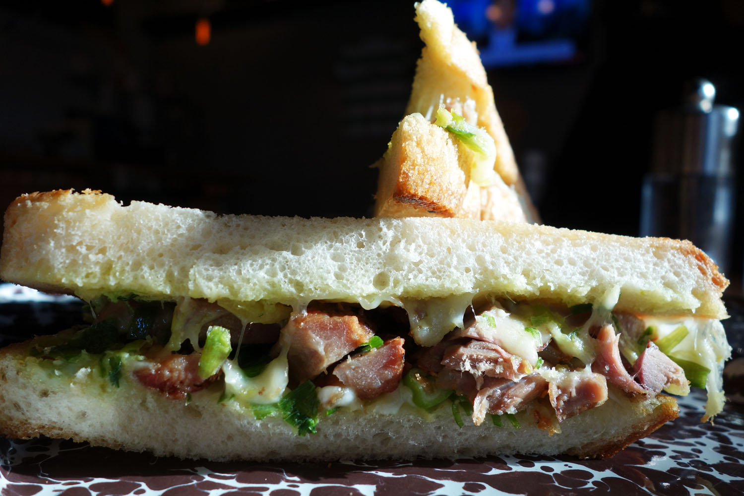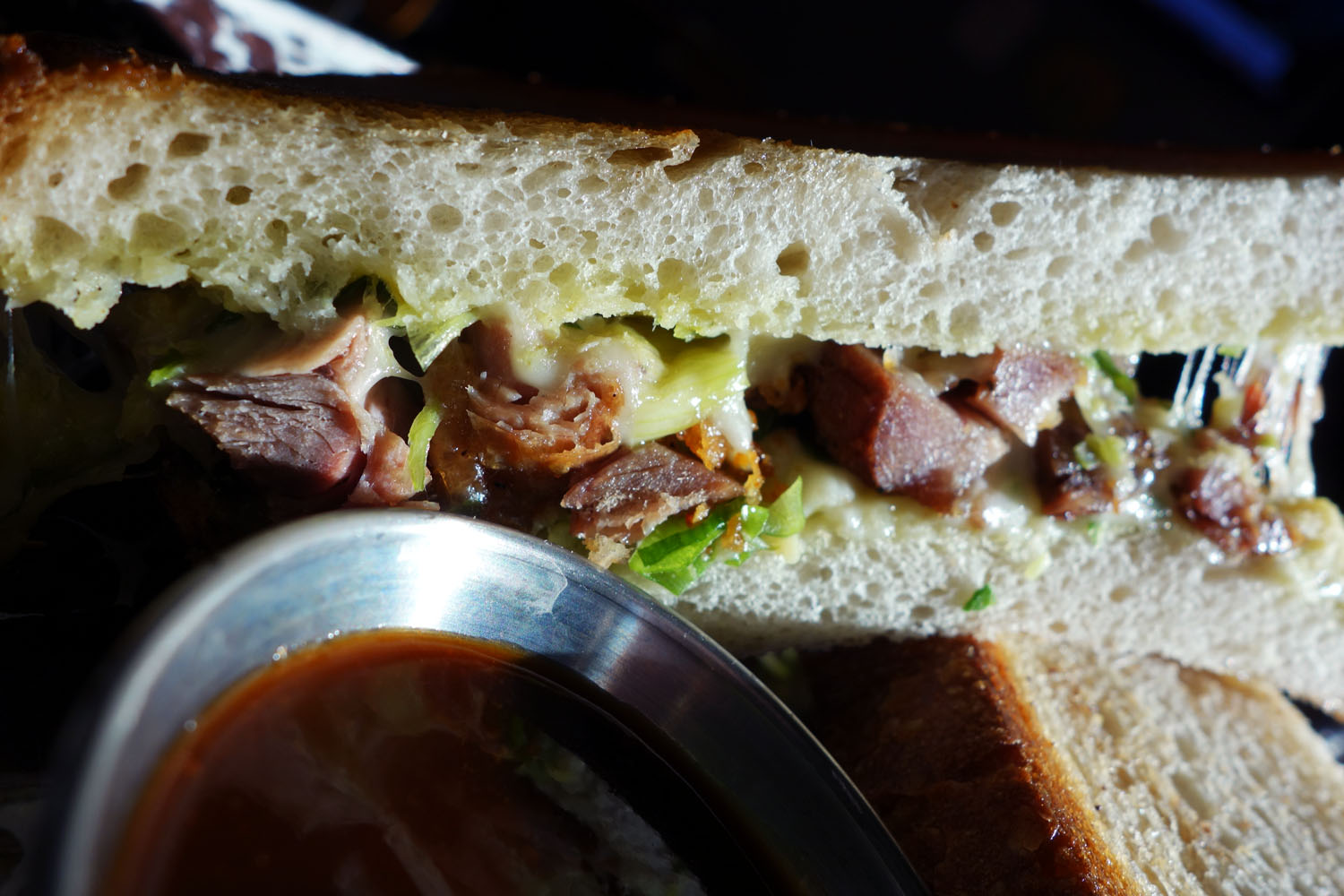 I also got the restaurants signature sandwich, the “Duck Pancake” Grilled Cheese, with two thin slices of sourdough, some gooey provolone, plenty of bright green scallion and chunks of tender duck meat packed in. The sandwich came with a nutty, salty hoisin sauce that, when combined with the duck and scallion, gave the sandwich a slightly Asian spin. The duck meat was nice, only slightly chewy but in the way that is characteristic of the bird anyway. The flavors of the duck spread through each bite, combining with the zingy freshness of the scallion and the very mild provolone which was mostly there to bind things together and provide a juicy, moist texture to contrast the crispy grilled bread. I enjoyed sauce-less bites of the sandwich, as the duck had quite enough flavor on its own to keep things interesting. The duck-less crusts, however, were salvaged by dipping them into the sauce which added a ton of flavor as well as a much-needed moisture to these bites. Not too greasy at all and very satisfying (a half was quite enough for me!)