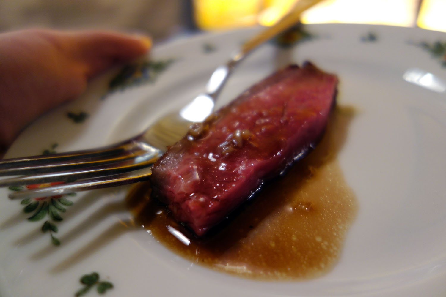 Perhaps the most anticipated dish was the 32 oz bone-in NY strip, dry-aged 40 days before being cooked to order, topped with a wonderful agrodolce and the meat’s own juices. Gloriously tender, bright red in the center, a very slight hint of aging but not too funky for the steak-purist. For the sake of the event, it was chopped up into bite-sized chunks heaped over the bone, which looked pretty cool.