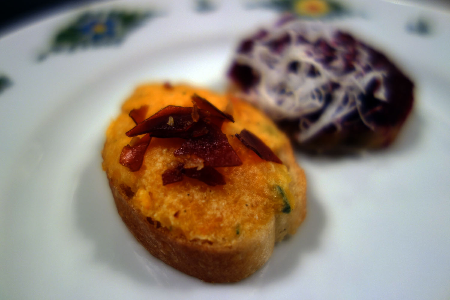 A colorful tray of crostini circulated as well, the Crostini di Zucca (with winter squash, sage and a bit of crispy speck as garnish) and the Crostini di Barbabietole (roasted beet and some tangy soft cheese shaved on). While I though the squash was a bit bland (despite the salty speck) and could have used more seasoning, the roasted beet topping had the perfect combination of natural root sweetness and earthy minerality, offset nicely by the acidity of the cheese.