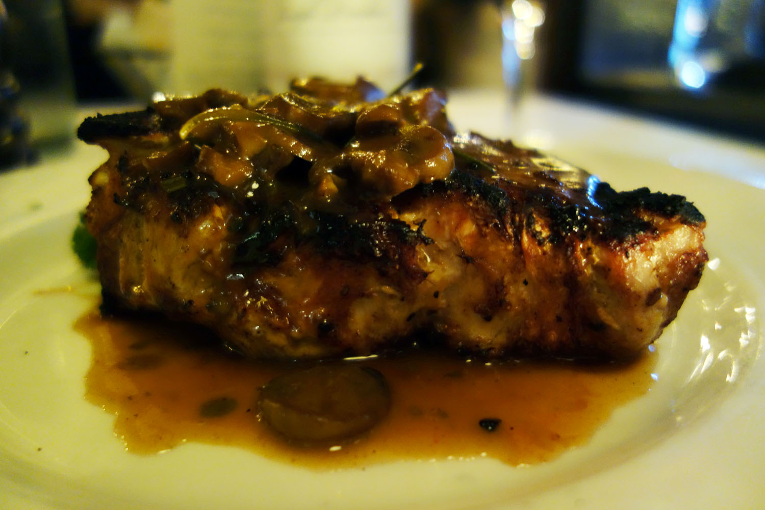 My sister-in-law and I shared a 12 oz. Filet Mignon, cooked rare, with which we ordered some bordelaise that came on the side. It was a longer piece of the tenderloin than what I’m used to with filet mignon, but one which was consistently delicate and satisfying all the way through. Tender, juicy meat cooked perfectly with a peppery, slightly smoky sear and bloody, moist flesh inside. A light layer of crunchy onion strings over the top, easy for the filet mignon purist to scrape off, but enough for those ordering this cut well done to get some nice texture in their meal. The bordelaise was a bit goopy and too starchy, a gravy-like thing which proved to be largely unnecessary, since the quality of the cut itself was great. Easy to chew, soft flesh and juice with plenty of flavor on its own.