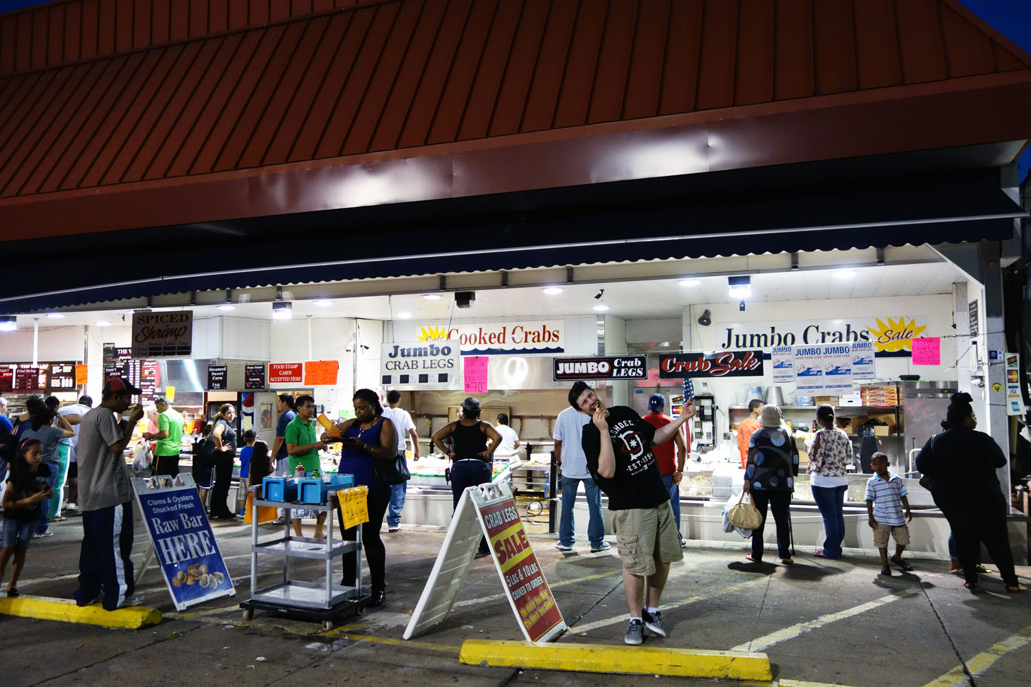 One reason I love when friends visit me in D.C. is that it gives me an excuse to get away from work, venture out on foot and explore the city, treding paths that would normally be out of the way and, consequentially, ignored. I had this opportunity again recently, when a friend from Boston was in town for the weekend. Cooling down on a hot summer afternoon with some Coronita-Margarita-Grand Marnier concoctions at the always classy Cantina Marina, we decided to walk down to the Kennedy Center to check out a view of Georgetown. Pretending I actually knew how to get there, I steered us down the boardwalk of Southwest Waterfront, and after a short stroll we stumbled upon something that I immediately knew would be special. Brightly illuminated stands, shadowy figures staring up at menus, pyramids of ice, buckets and bushels strewn about. There would be good food here.