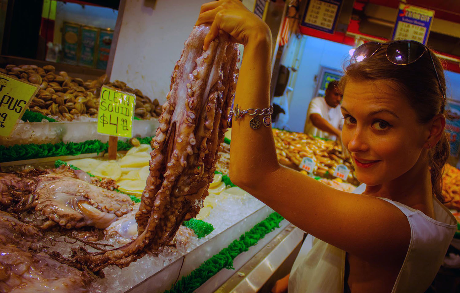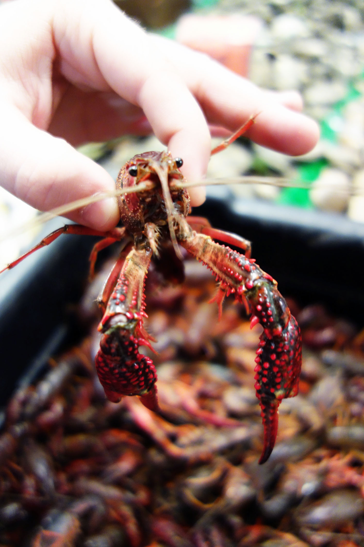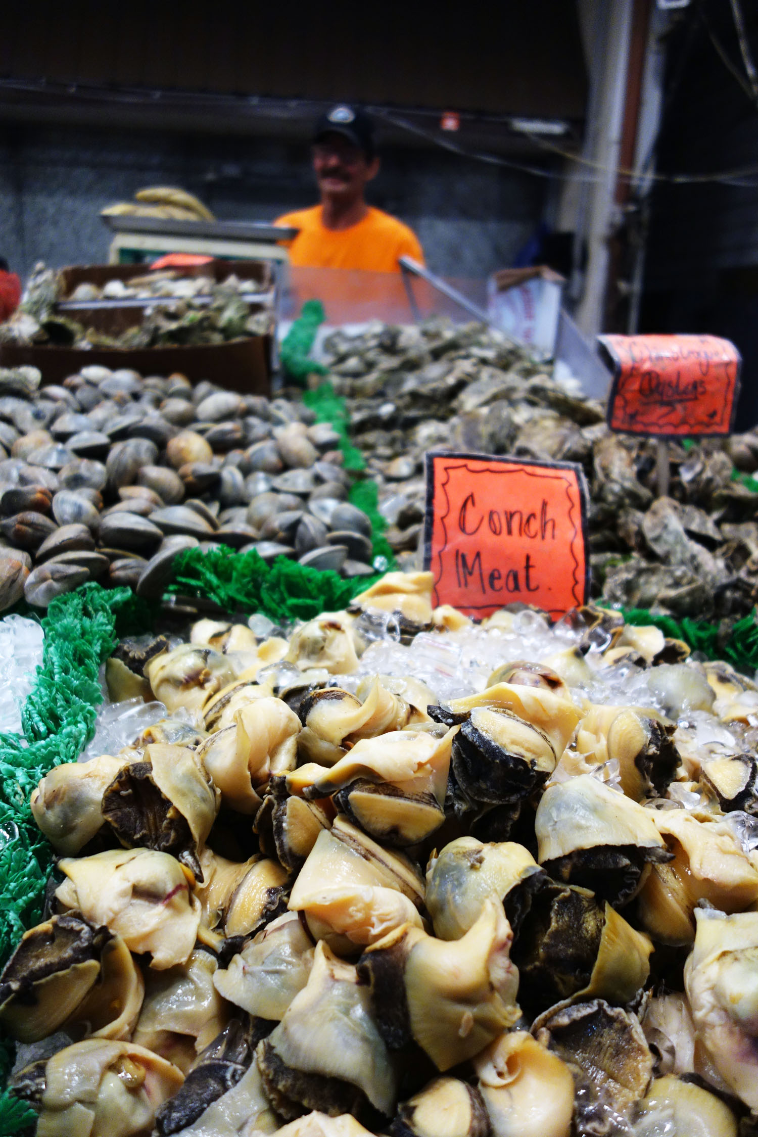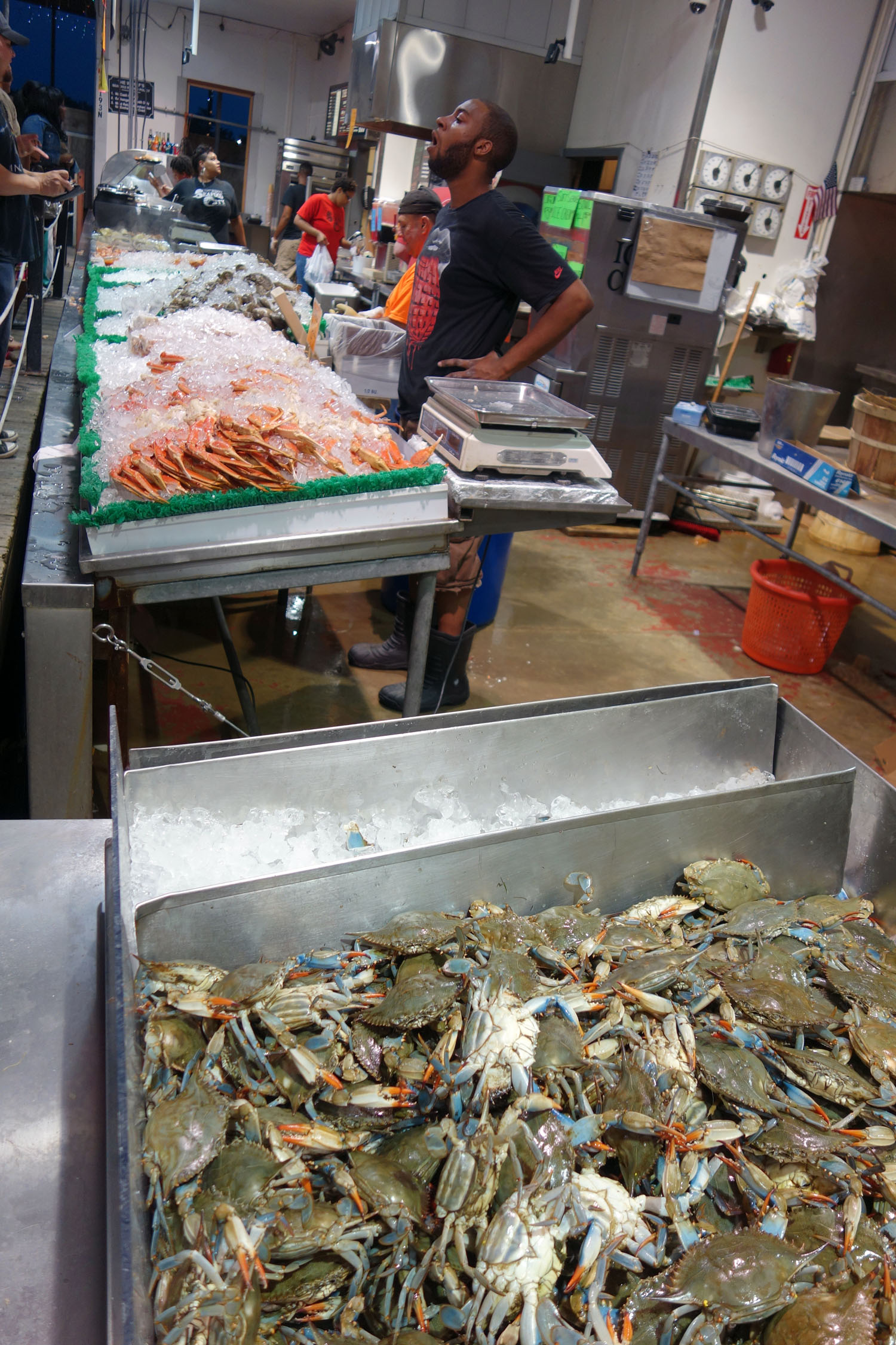 Fish, clams, scallops, conch, oysters, prawns, squid and octopus everywhere. But clearly one thing dominates, and that is the Chesapeake blue crab. Crawling around and pinching at the air with muscular blue claws, looking delicious…