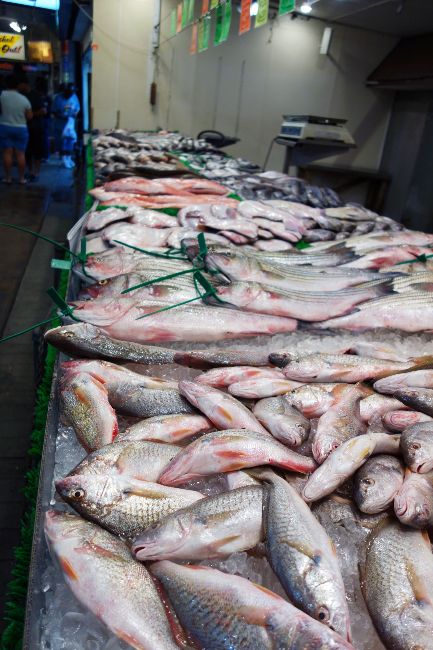 The place turned out to be Maine Avenue Fish Market, which is actually the oldest continuously operating fish market (1805!) in the country. Tucked away in the armpit of Interstate 395, this market seems to be a very well established landmark among locals in D.C. but isn’t as known to out of town’ers who, ironically, buy their travel guide recommended “local crab cakes” at less direct (and, in my opinion, less cool) sources, right on the tourist trail. The market is composed of maybe 8-9 different stores, which all seem to have Chesapeake blue crab in common but differ in some of their other specialties. There is definitely a sense of history here, which becomes evident in the type of interactions I witnessed. Everything seems very smooth. Vendors are not explaining their products, because buyers already know all about them. Most come with empty bushels and fill them to the brim with fresh crab, shrimp and fish sold by the pound. Kids get something prepared to nibble on while parents place orders and wait. No one besides me is taking pictures or bouncing around to learn what’s best where.