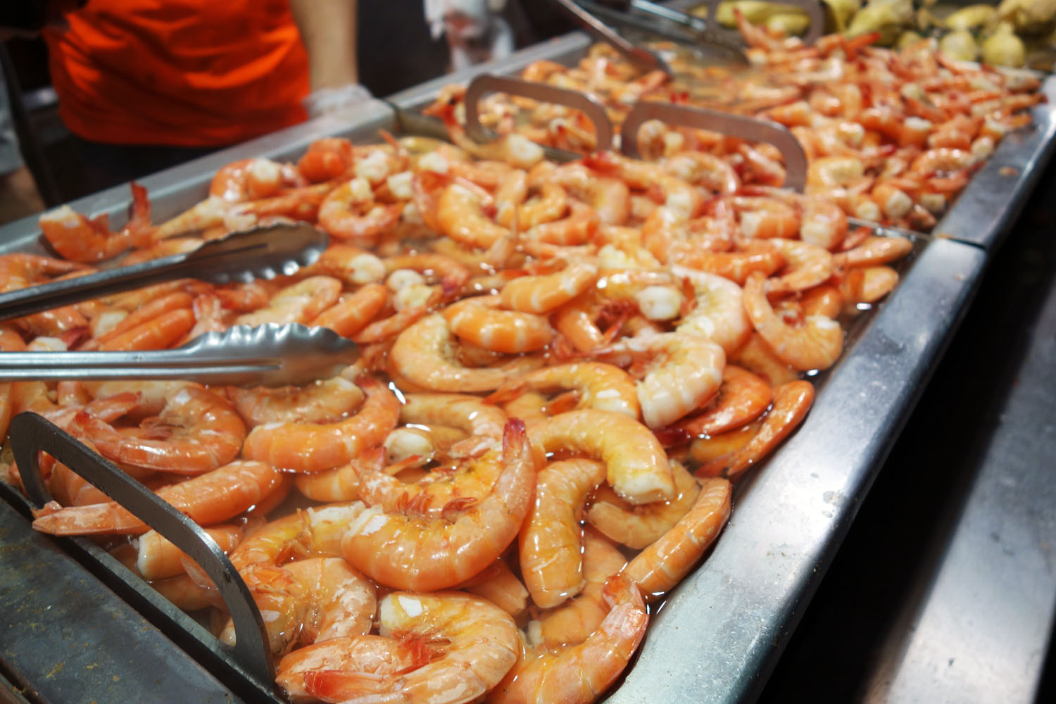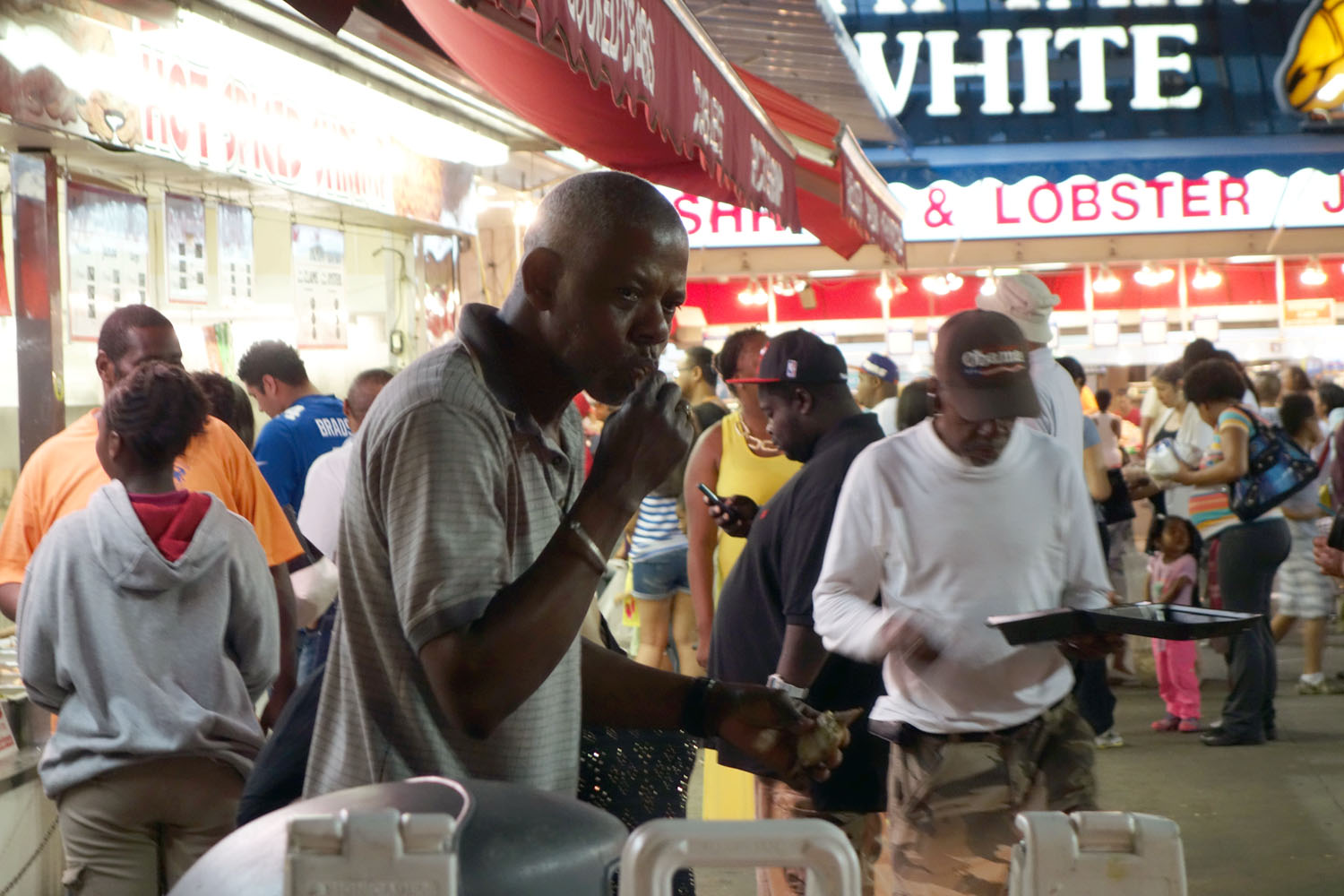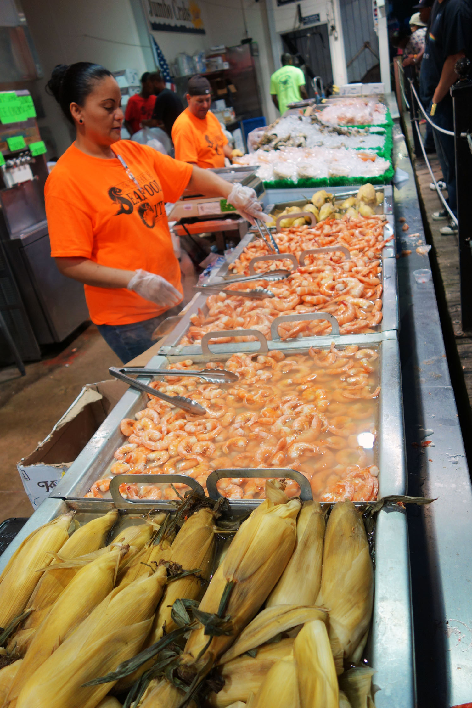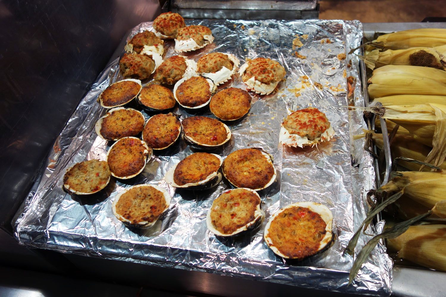 Next to a huge tray of corn on the cob, there is a vat of steamed jumbo shrimp, moved around every once in a while by a tong-bearing lady. Upon approaching the stand, she picks one out, dips it in Old Bay and hands it to you with a smile, without your even having to ask. The shell comes off easily and the meat inside is juicy, tight and tender. It’s actually very sweet, no subtlety at all, which makes the very salty Old Bay the perfect companion, taming that sweetness without masking it.