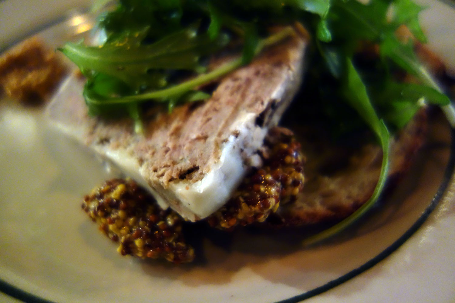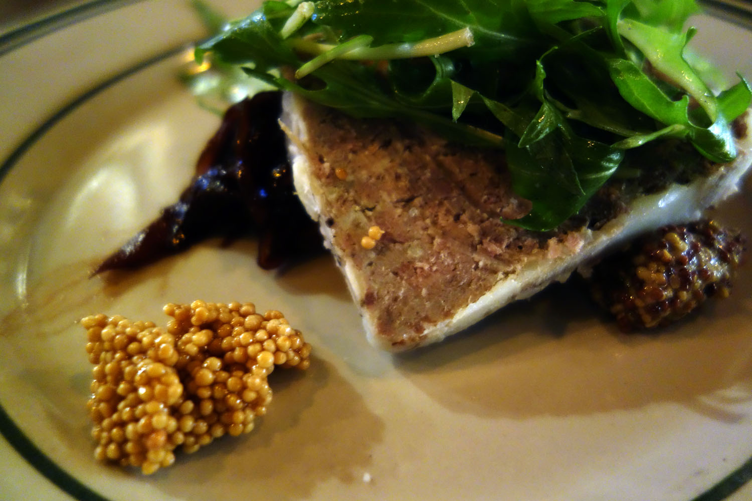 It was a wonderful surprise that despite “trotter” being in the name of the restaurant, the menu was not dominated by charcuterie. Because while I love the stuff and appreciate it becoming a trend in country full of organ meat haters, it’s getting old. Of course I enjoy sitting down at a restaurant with “pig” incorporated into the name and being brought out a chef board of head meat with traditional accoutrements. But, honestly, I don’t need it every day, just like I don’t need oysters or uni every day, especially if it is an afterthought of mediocre quality added to the menu just to stay in vogue. At KT&T, it’s not an afterthought. There is only one type, a Housemade Farmhouse Terrine, and it speaks for itself. It has a bite to it but melts readily on the tongue, leaving metallic notes from pork liver and some herbs rounding out the flavor. The terrine sports a bright white coat of silken fat, which also melts from the heat of the mouth and breathes decadence and flavor into the mushy forcemeat. A wine and carmel flavored red onion compote at the base adds crazy little hint of vinegar and sweetness while the pickled mustard seeds and dollop of whole grain mustard add a slightly cleaner acidity and heat to even out the fatty richness of the terrine.