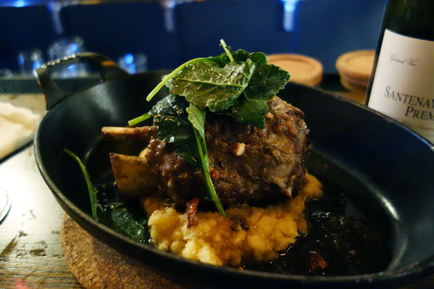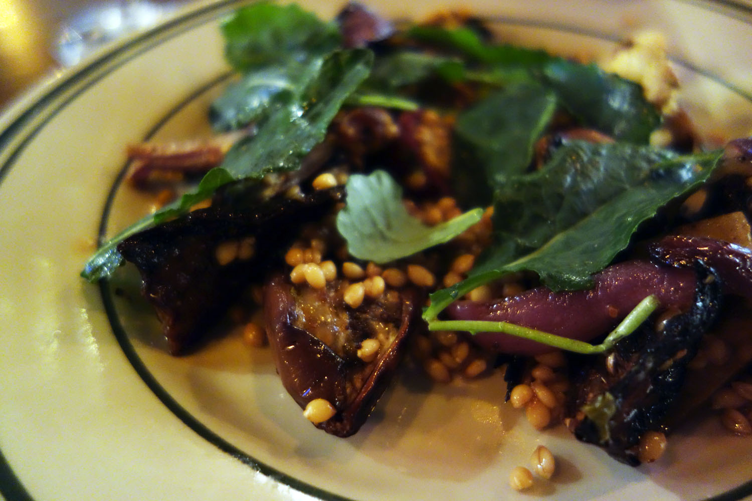 The Grilled Root Vegetable Salad is a playful mess of delicious things, a dish that looks much like one made by a man picking veggies off the grill and throwing them onto a plate before moving onto flipping the meat. No dots of vinaigrette running up the side, no spoon-sweeps of wine reduction or finely chopped micro-chive anywhere on this plate. It’s a heap of onions, cauliflower, Chinese eggplant and beets all cooked to a wonderfully caramelized but still firm point and served cold, sprinkled with chewy farro for textural intrigue. Over the top there is a rough layer of green baby kale leaves adding a dank, musky, earthy note. These leaves contrast wonderfully with the piquant and slightly spicy pimente d’Esplette vinaigrette. The latter is drizzled on, just enough to make the veggies glisten and give them something to offset the smokey char lining their exterior. A great dish for the season and a really nice little gift for those pesky vegetarians out there. For these three the Peter Lauer Sekt Riesling, a fluted sparkling dry Riesling from Saar, NV was the perfect complement.