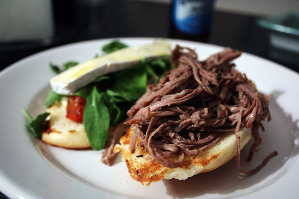 Day-old beef, leftover steak from the night before, already seasoned with plenty of garlic (I like that) and ginger and rosemary, were thrown in a pot of beer (!) and some other stuff mixed in and braised to a point of falling to shreds. The structural integrity of an apartment was put at risk to create this meal and a over-dramatic girlfriend was tricked into thinking the stove was left on for hours with no one home by accident. The beef was pulled easily apart into beautiful, moist ribbons of warm, tender flesh, basted a bit with its own cooking juice, and placed on half of a roll. This roll was purchased minutes before at a local panaderia with somewhat obsessive precision – an endless Q&A about freshness, shape, moisture and type rattling off across the counter. I like precision. The roll halves were also toasted in a pan with some butter to crisp them for textural contrast against the juicy, soft shreds of meat. The other side of the roll was topped off with some fresh baby arugula, a slice of brie and some sauteed cherry tomatoes, poor little things bursting out of their caramelized, smokey skins, robbed of their youthful freshness. Slapping the two sides together and letting all these things combine resulted in something truly wonderful, a perfection that surprised both myself and its creator, especially since it was his first time venturing into braised pulled meats. The humid heat of the moist, impossibly juicy meat melted the brie almost instantaneously, turning it into a creamy, salty binding agent which held together the two sides. The meat itself had a serious depth of flavor – the murky base of the beer, combined with the freshness of the ginger, the sweetness of all that garlic and the fireplace comfort of the rosemary creating something pretty mature and downright elegant in the sandwich. The arugula maintained its leafy green freshness, its cool and its peppery attitude while the tomatoes flooded the bite with a caramelized vegetal moisture and the bit of acid which was necessary to round out this sandwich. The bread held its ground against the meat, staying crispy and light instead of going soggy. And the pride and congratulatory kisses that came with the sandwich was the perfect dessert.