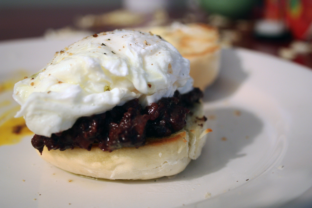 I don’t think there’s anything I appreciate more than my first meal of the day being thought out and made for me. Having just woken up, I can barely think and am still chasing after the details of my dreams when a tray of good-looking num-nums appears, and like Marie Antoinette I pick at things bird-like, feeling truly regal and spoiled and happy and satisfied and thankful beyond measure. My absolute favorite is this improved Eggs Benedict. Toasted roll with morcilla squeezed out of its casing and crisped up like corned beef hash in the pan, topped with a delicate angel-soft poached egg, drizzled with a tiny bit of olive oil and sprinkled with dry spices or just a tiny bit of pepper. The yolk explodes when bit into and floods the mouth, coating it with its protein-rich velvety smooth texture. The salty, slightly sweet, deliciously irony and earthy morcilla follows with its mushy softness contrasting against the crispy char on the bread. The trembling, light egg white is the ying to the morcilla’s gloomy yang and the bread is the canvas on which they are painted.
