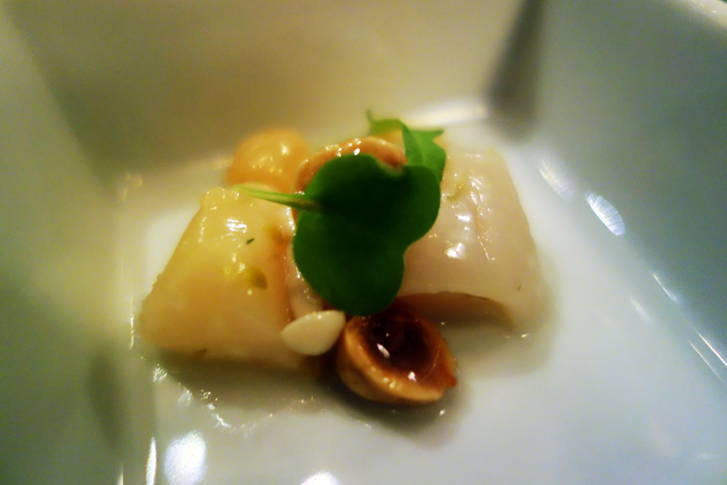 A rather etherial looking mound of scallop was served with toasted hazelnuts, whose tanned, nutty flavors vibed well with the aromatic cold smoke licking the surface of the delicate marine flesh. A bashful Beech mushroom peeked timidly out of and then camouflaged back into the translucent, milky-white bosom of the scallop. It worked texturally, as the hazelnut was left in large halves, providing a meaty crunch to offset the slippery smoothness of the rest.