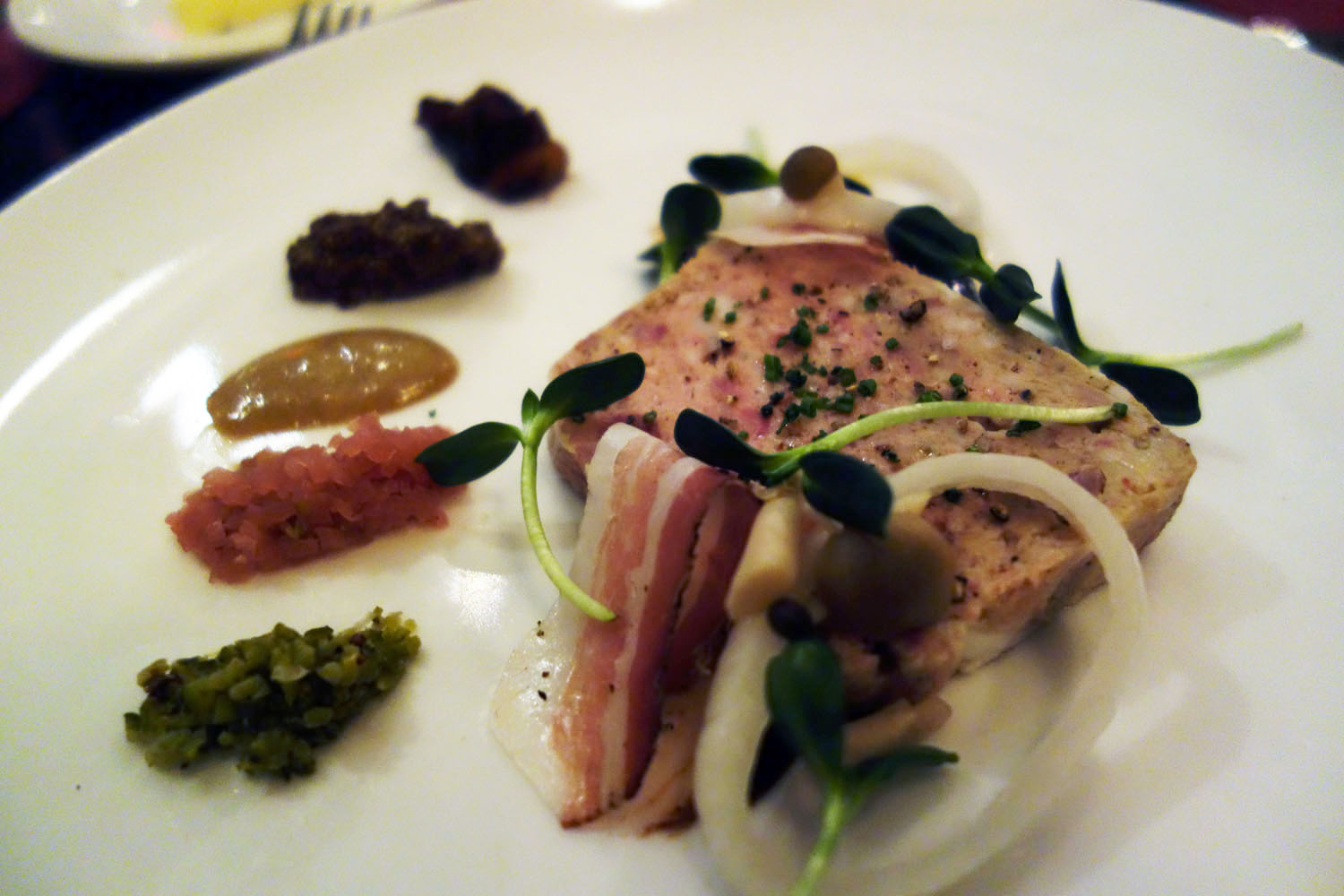 We had the House-Made Pâté de Campagne, a single large slab of wonderfully crumbly belly and face meat and liver. I enjoyed that the focus of the dish landed on a single creation and preferred this to their past assiette of terrines, which included smaller chunks of country terrine along with a foie torchon and a headcheese. Tasting boards are cool, but adopting a single terrine as your forcemeat of the night feels cozier, definitely more satisfying when it has to be shared. It turned our attention to the quality of the one and to the accoutrements scattered over the plate, each one taking the meats in a different taste direction. The pâté on its own was very tasty, flavored with Armagnac, despite it being mostly pork and not duck. It was smooth in some parts and chunky in others, fatty all throughout. There was a ribbon of house-cured pork belly introducing a bit of aged funk, along with some wine vinegar pickled onion ringlets that added even more maturity to the dish. A jammy sauce of dates and sickly sweet Maury wine appeared at the base; this was my mom’s favorite thing of the night. There was a juicy relish of cornichons and shallots pickled in and saturated with red wine vinegar. There was a whole grain mustard whose floral heat and beady texture was a pleasure for the tongue. There was also a Passover time charoset, a mish-mash of raisins and nuts and apple-autumn spices as well as my favorite, a smooth mustard with a powerful kick of caraway. My mom remarked how like a painter’s palette this dish looked. I’m happy the cavas has become the terrine itself.