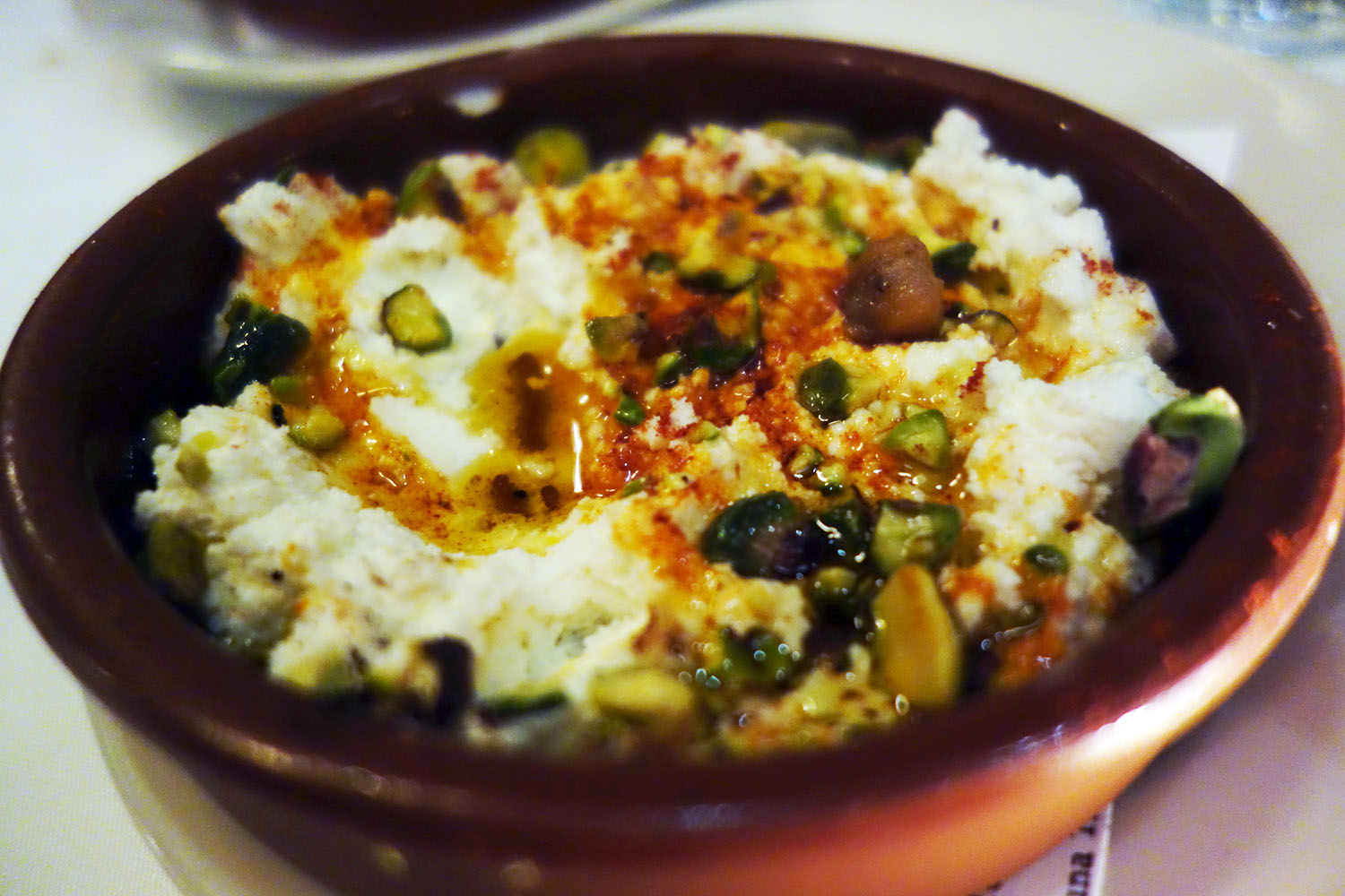 Another great veggie dish is the Whipped Sheep’s Milk Cheese topped off with toasted pistachios, a drizzle of olive oil and a sprinkle of paprika. Smoky Spanish pimentón – sure – not Hungarian paprika, but I appreciated the dramatic color at least. This is a simpler dish and a good alternative to a board of firm cheeses which are far out-shined by the charcut anyway. It is tangy and warm, melting readily over the hearty slices of toast stuck in. The pistachios add a crunch and a sweetness that the smoke from the pimentón balances nicely. For those who like this kind of spread lumpy (e.g., me) it’s easy to just spoon the cheese on. Mixing the oil in makes for a smoother layer for those who prefer it that way.