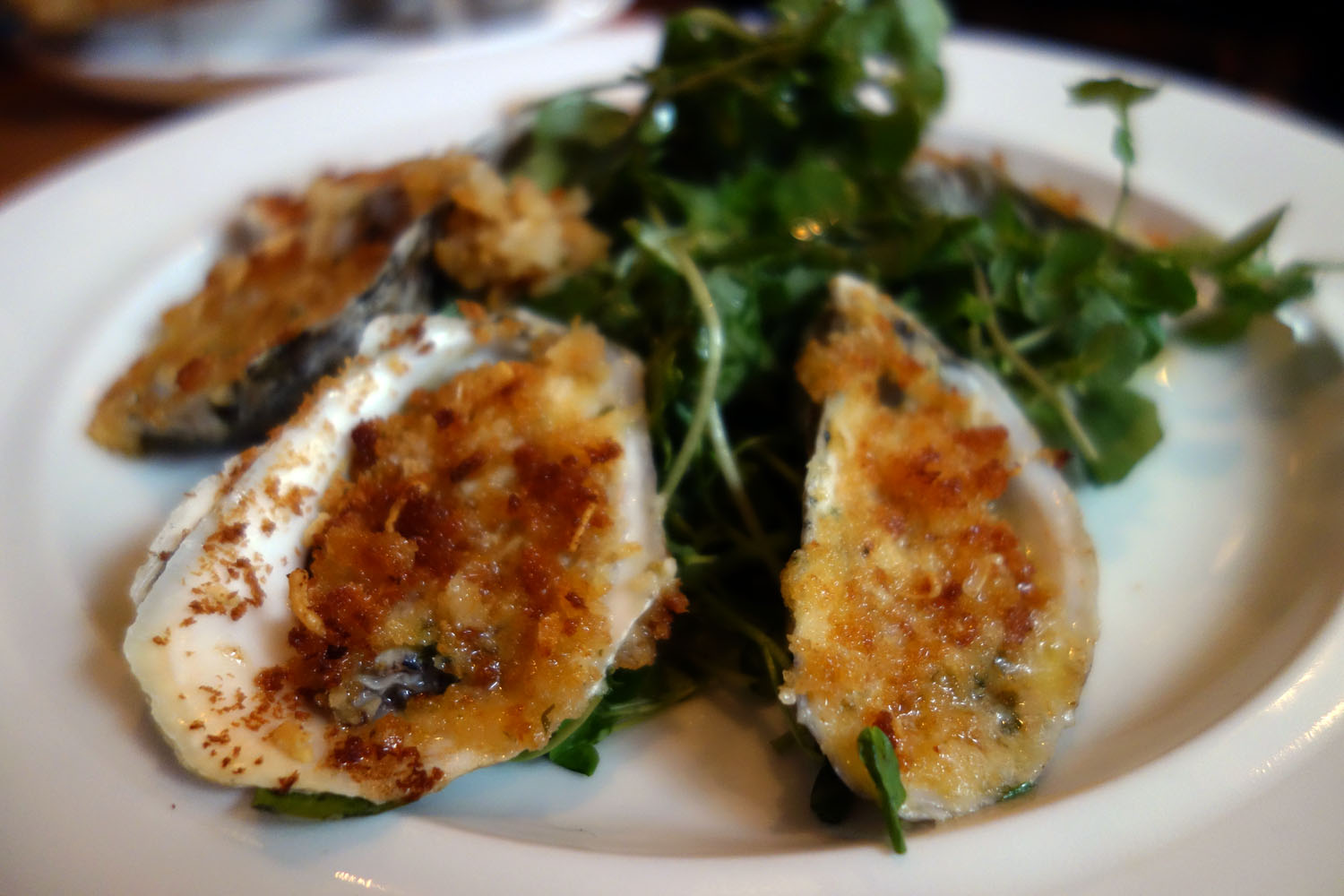 My heart set on a fully oystered-out meal, I also ordered the Hog Island Style BBQ Oysters, Chef Jamie Leed’s recipe inspired by the cuisine of Hog Island, California. The dominating flavors are those of of white wine, shallot and thyme, with a bit of fresh parsley, Tabasco and lemon juice in there as well. The oyster body is barbecued on the half shell after being doused in this sauce. The soft, springy flesh soaks up the flavors, which blend with the marine sweetness. The bread crumbs are added last. They crisp up and get a nice tan. Their texture is that of smooth sand on a sunny patch of a beach, the perfect contrast to the moist, juicy oyster buried underneath. There is a little salad of delicate baby arugula lightly dressed in a citrus vinaigrette, which proudly takes the title of “side” rather than setting for that inferior apellation of “garnish.” The dish is comparable to Pearl Dive’s grilled oyster with its spicy chili oil, but the wine-thyme sauce is more delicate and much less overwhelming in flavor.