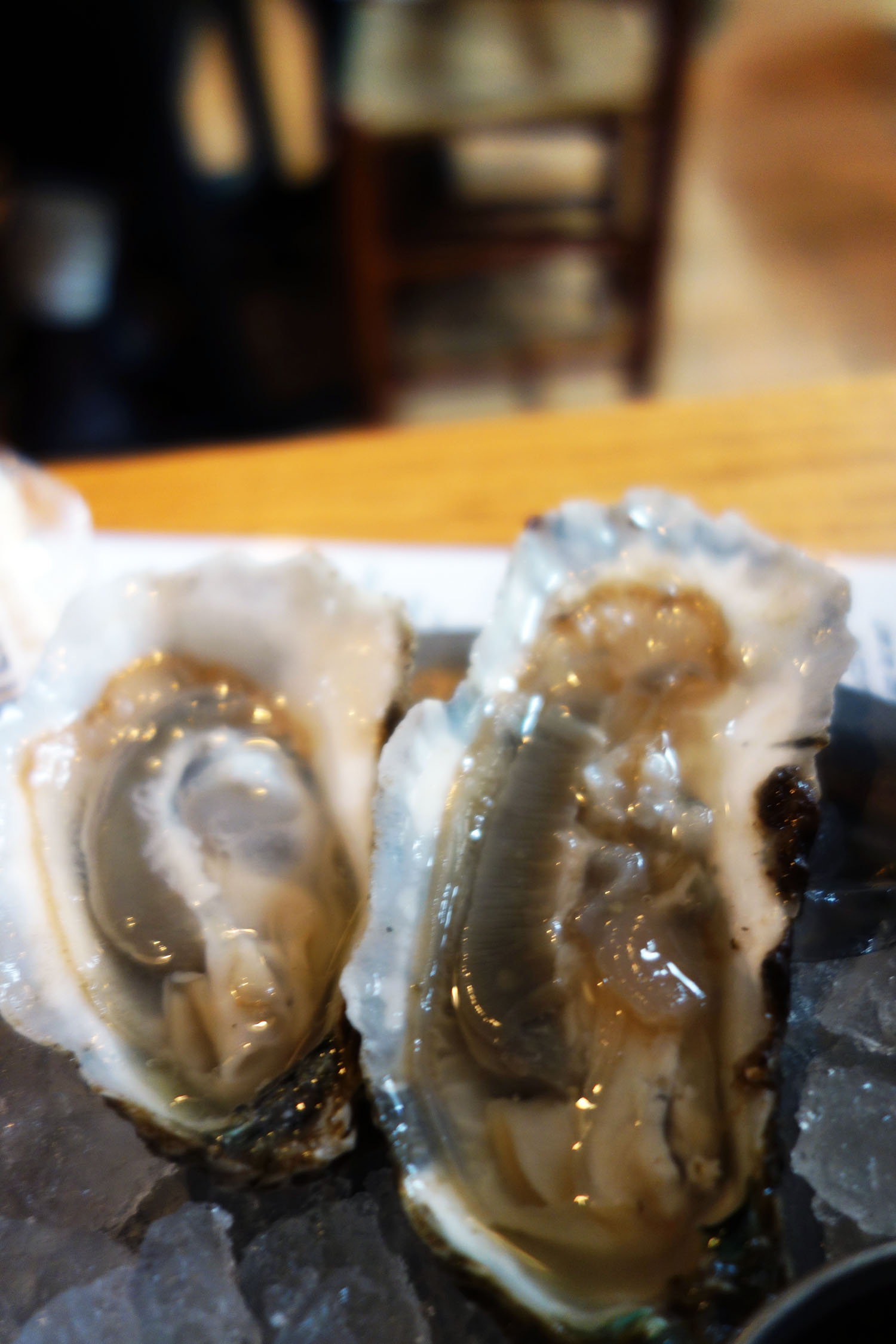 Shucking technique aside, there’s not much to say about a kitchen’s capabilities when it comes to raw oysters on the half-shell. This is especially true for the purist who does not apply mignonette. I guess the curation of the oyster list can receive praise – the selection proudly chalked up onto a huge board was a good one, mostly local with some not-so-local faves tossed in. I had New Points and Stingrays from the Chesapeake and Kumamotos, because I can’t help ordering them when they appear before me on a menu. I honestly can’t choose favorites, as I enjoyed them each in their own way. Kumamotos, the small and fruity little Japanese imports, were quaint and delicate; bite-sized bonbons of slippery, cool marine flesh. The Stingrays were just the opposite – plump and floppy, very mild in flavor. More of a textural thing with these guys. It was my first time trying New Points, famous for their gorgeous elliptical shells that have deep grooves filled up by the animal’s body. These were significantly meatier, firm though still smooth. The New Points were similar in flavor to Stingrays, though maybe slightly saltier. Icy cool and wet when sucked up between pursed lips. Each one felt like a splash of ice water on my overheated, pounding temples.