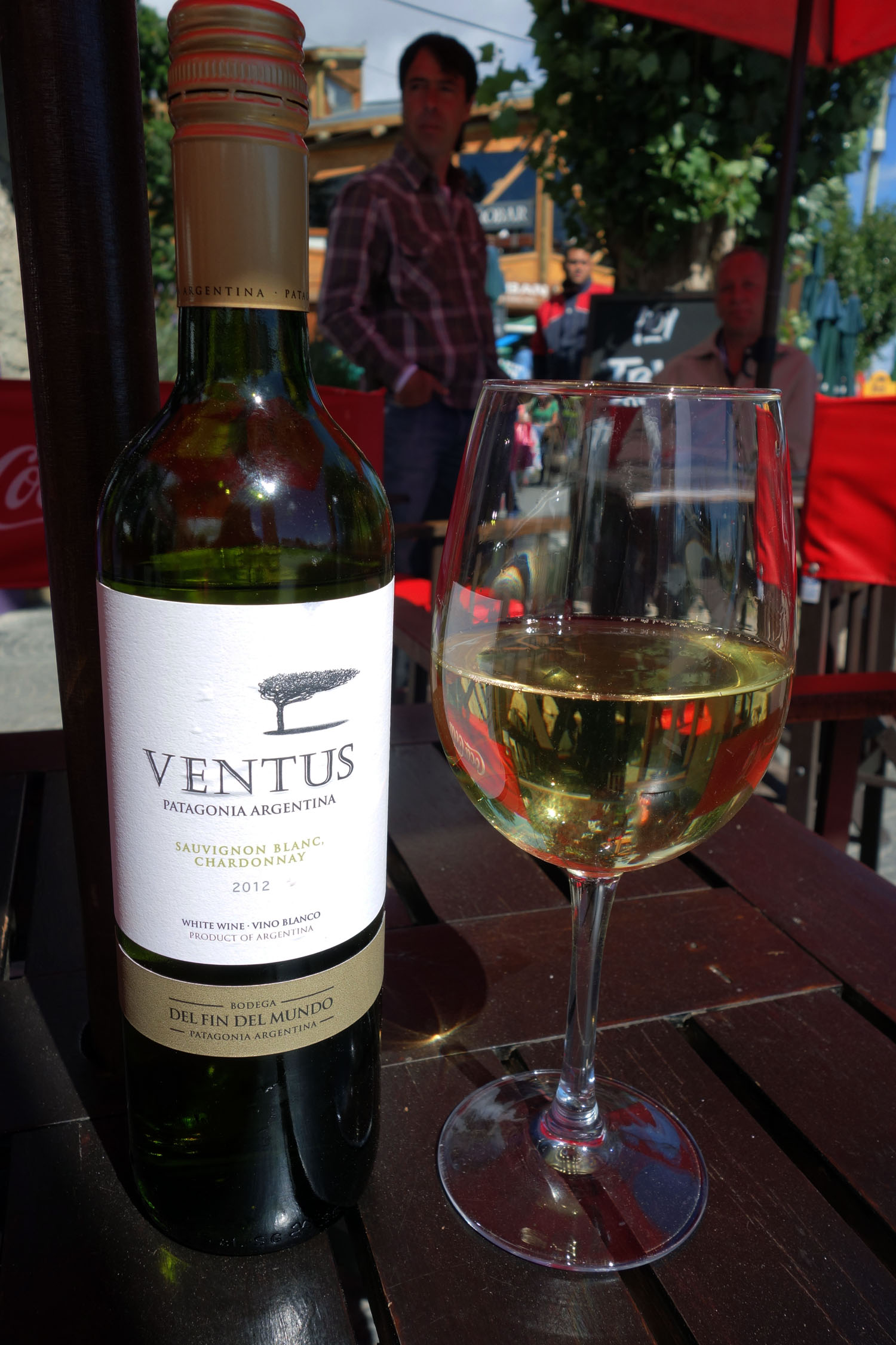 Between the glacier tekking, mountain climbing and sheep herding I also devoted some time to lounging around in “downtown Calafate.” I passed by the casino but did not go in. I walked through a feria of artesenal junk but did not buy anything. I visited the main square and stores that sold a variety of camping gear. At some point I got tired and flopped myself into a red and white Coca-Cola beach chair outside San Pedro Resto Bar. Needless to say, the place had both lamb on a parrilla and Patagonian trout. Their special of the day was “asado de bife.” I chose the place because I didn’t have too much money left and I wanted an empanada. When I peeped their menu I saw something I liked: a lamb empanada. I’d never had one of these before and it seemed like a perfect snack for the time – small but packed with something that was bound to be delicious. It did cost a whopping $30 pesos, which is ridiculous for an empanada in Argentina, but I guess when you divide by 10 (to get $3 USD) it’s not that bad. I ordered one, along with a generous glassful of Patagonian Sauvignon Blanc (appellation: Ventus) from Bodega del Fin del Mundo, which cost about the same. I sat outside while I waited, people-watching and enjoying the gentle rays of afternoon sun on my back.