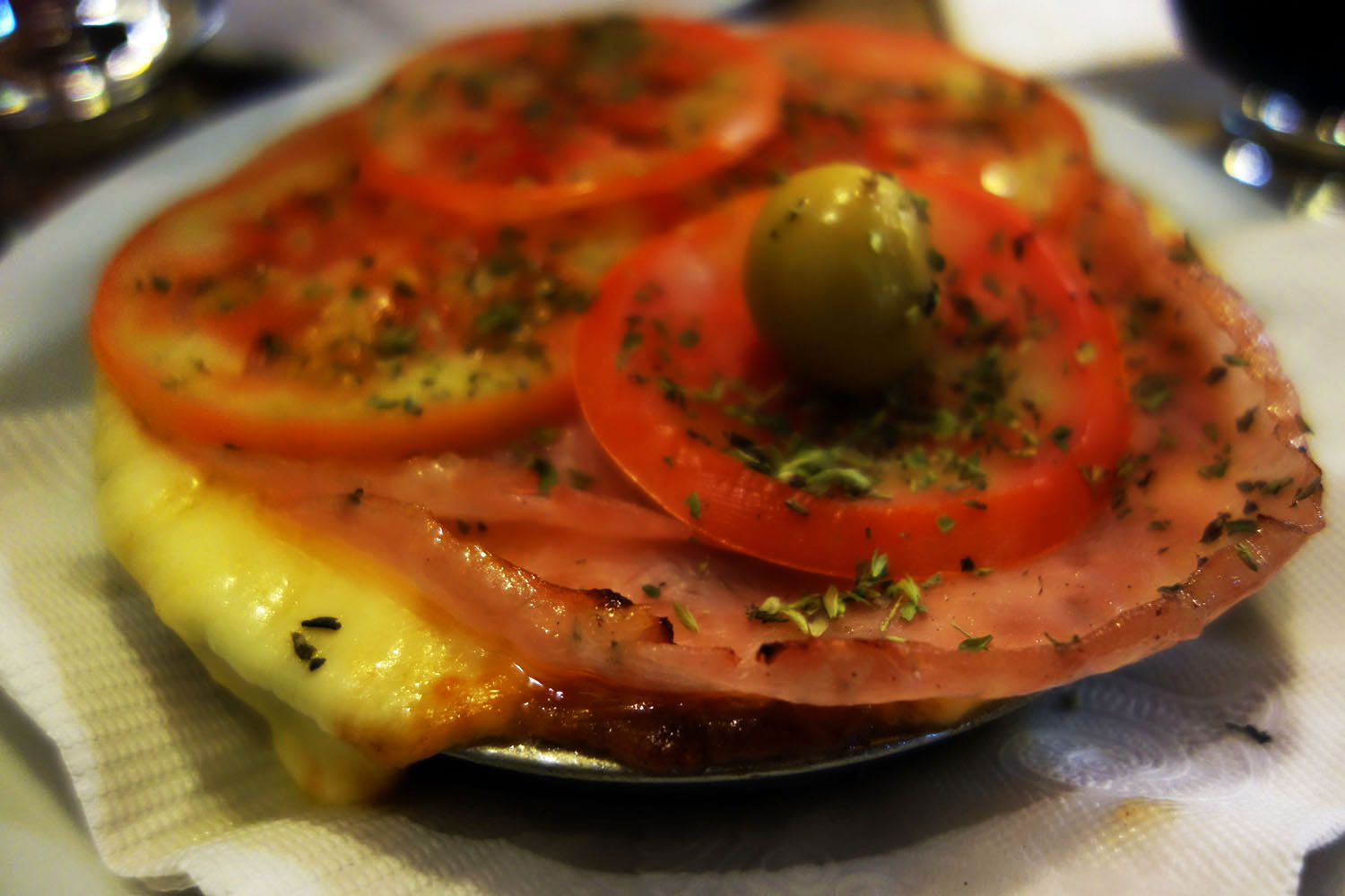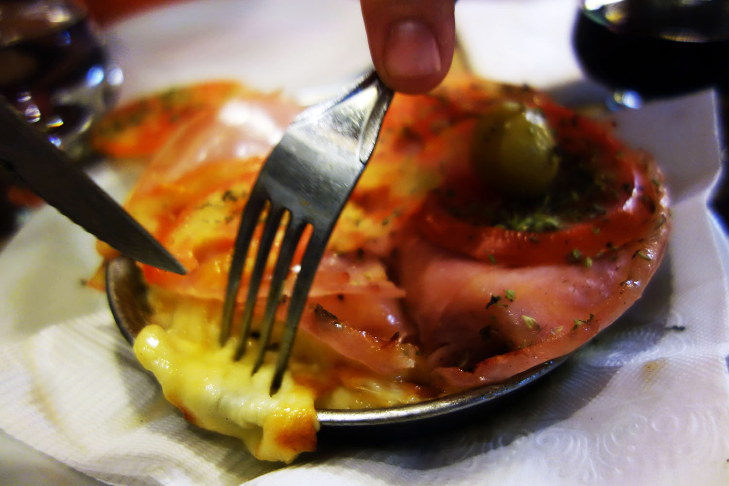 Another house specialty is the Provoleta Cuyana, which is the version of provoleta apparently traditional in the Western region of Cuyo. A big bowlful of provolone is topped with thin slices of cooked ham and tomatoes and sprinkled with a few green olives and dried oregano. The bowl is baked until the interior melts and becomes gooey and stretchy. The cheese near the rim bubbles over and becomes crunchy, as do the edges of the ham on top. The tomatoes are not the best, as baking them dries them out and removes most of their flavor and freshness. But I guess they add a nice color. The key here is to swiftly slice the thing into four quarters and move a piece to the plate before it gets stringy and rubbery hard. For this you will need an Argentine man with the innate ability to carry out a smooth transfer. It’s also important to eat the thing before the oil separates from the cheese and before chewing it becomes laborious. Standard at best is how I would describe El Sanjuanino’s version of this dish, which can be found at pretty much every restaurant in BsAs. I would recommend skipping this one here and getting one of the many specialties El Sanjuanino has absolutely perfected – the locro, the humita, the modongo – instead. Or…