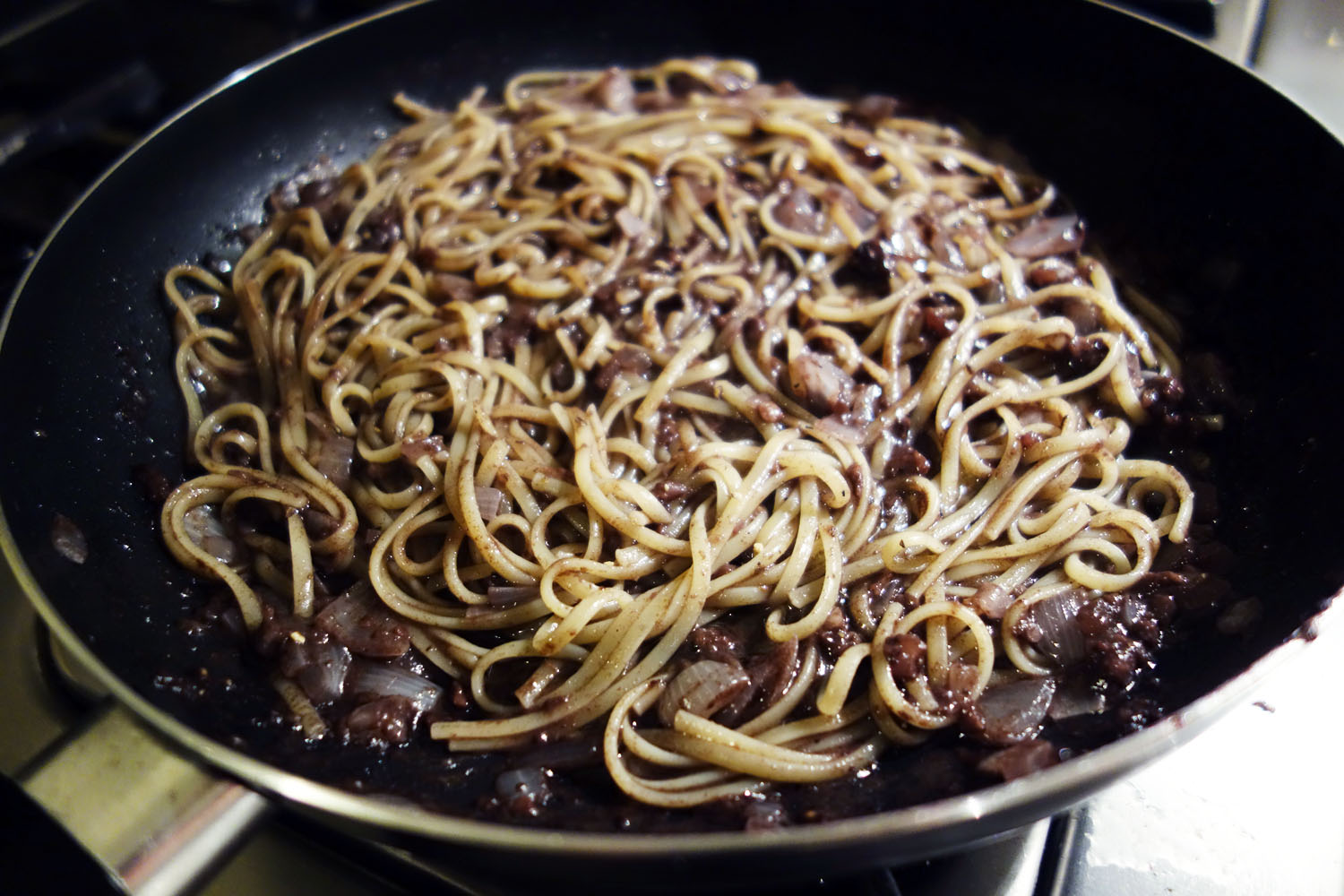 He bought a rather large pack of morcilla and had quite a bit left over. He decided to cook with it one night, having looked up a new recipe on his phone on the way back from a soccer game. “Morcilla pasta,” he said. “That’s gonna be dinner.” When we got home, I got in the shower and made moves to get ready for what I thought would be my last night in BsAs but which, due to a snowstorm, would be my second last. He set to work making a sauce out of the morcilla with some chopped up onion and wine. He added the noodles and sauteed them, letting the flavors of the crisped up, caramelized morcilla bleed into the pasta. Some chunks of leftover cheese were thrown in on a whim and the dish was plated with a medallion of the raw stuff lain over the top.