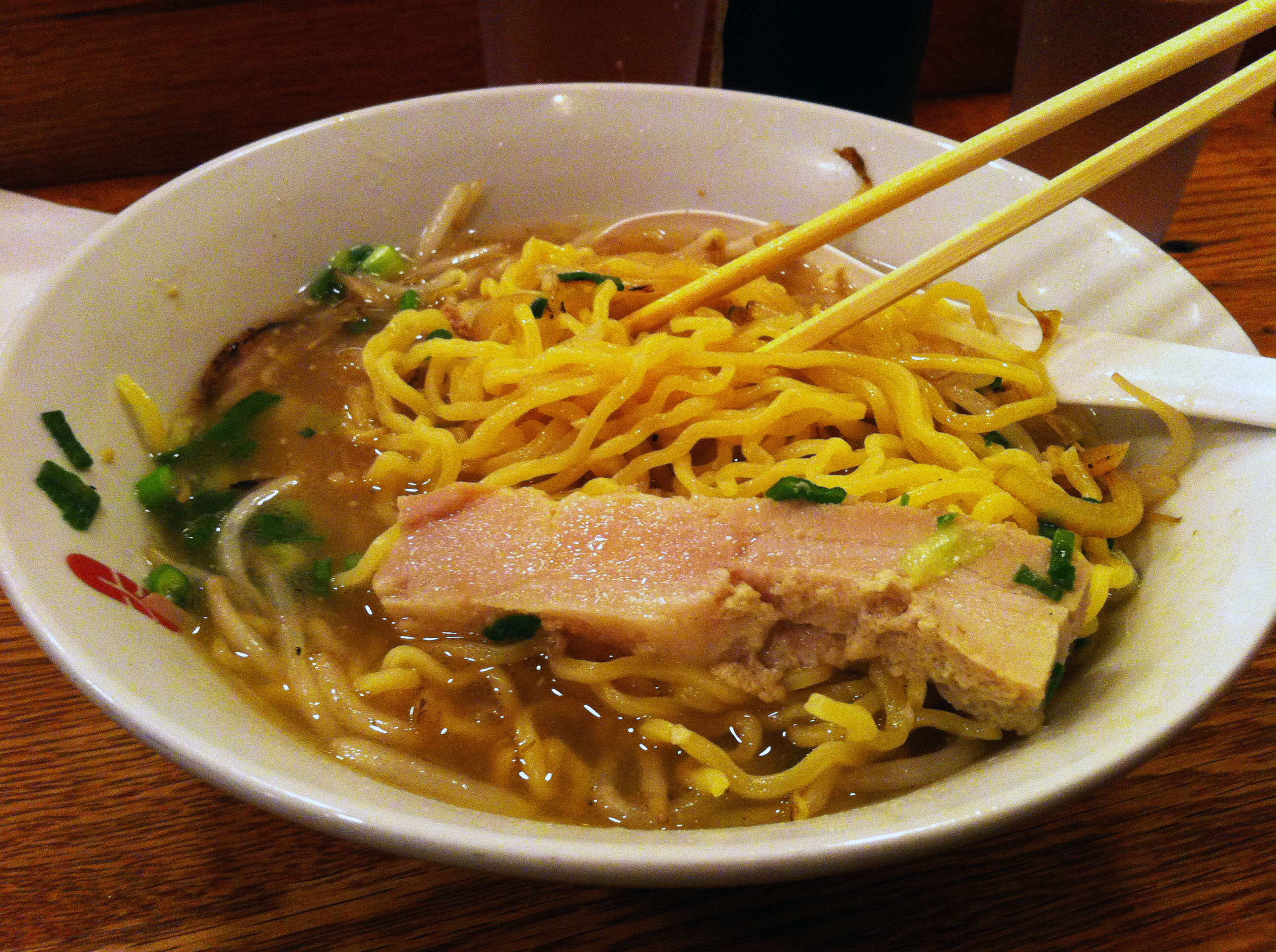 The bowl came with squiggly, dark yellow noodles drowned in the chintan broth and (apparently) topped with chashu, ground pork, wok-tossed bean sprouts, scallions, garlic and nori. There was a choice to add nitamago (soy-marinated soft-boiled egg) for $1.50 but it was apparently not considered a fundamental ingredient of the dish. There were also options to add bamboo, more seaweed, corn (?) and butter. Thinking I was getting a bowl of the house specialty the way the kitchen intended it, I chose to forgo these add-ons. But when our server mentioned I could also add pork belly, my resolve melted readily.