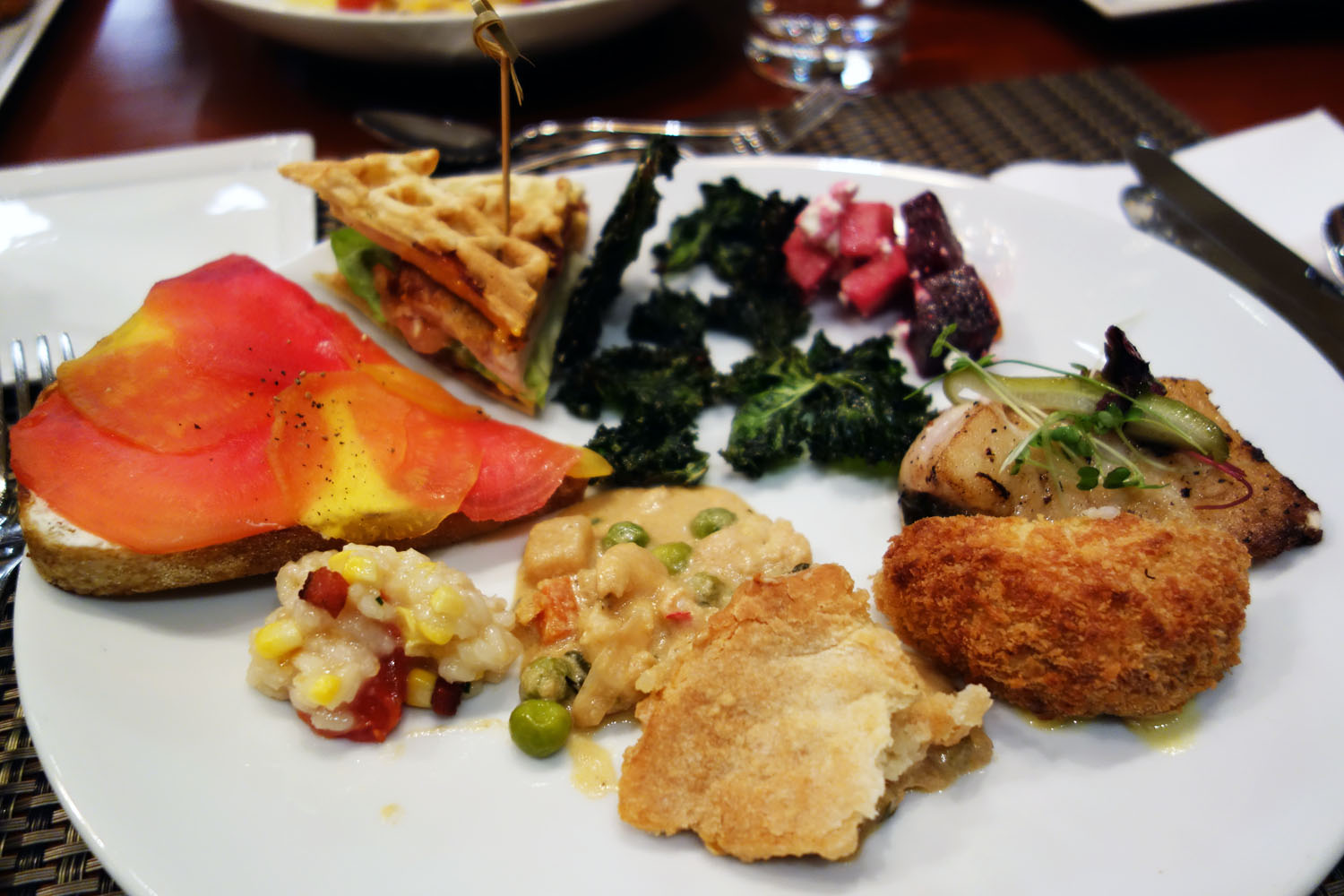 Tasting everyone’s creations: Beet and goat cheese open faced sandie, chicken and waffle sandie, lobster pot pie, rockfish and risotto, kale chips