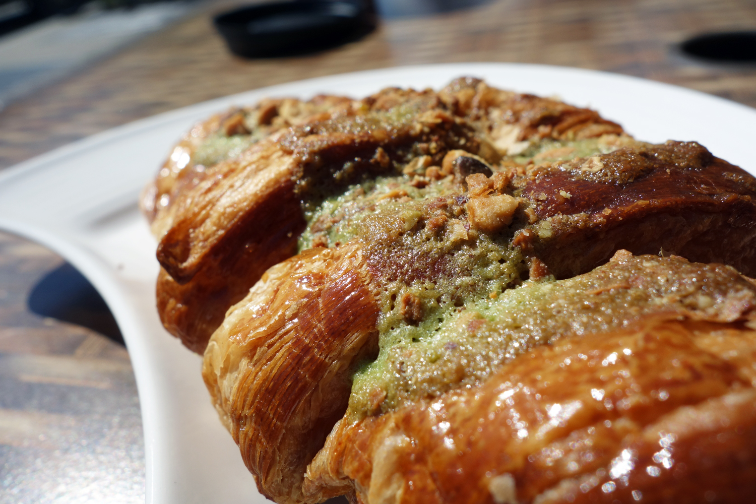 We also tried a pistachio croissant, which had a similar base but a crunchy crust of mildly sweet pistachio paste painted over the surface. A thick layer of neon green pistachio puree served as the filling. Again, good but just not good enough. The filling was too thick and overpowered the bottom half of the pastry which, again, looked like someone had sat on it. I went back inside to look around for some kind of saving grace.