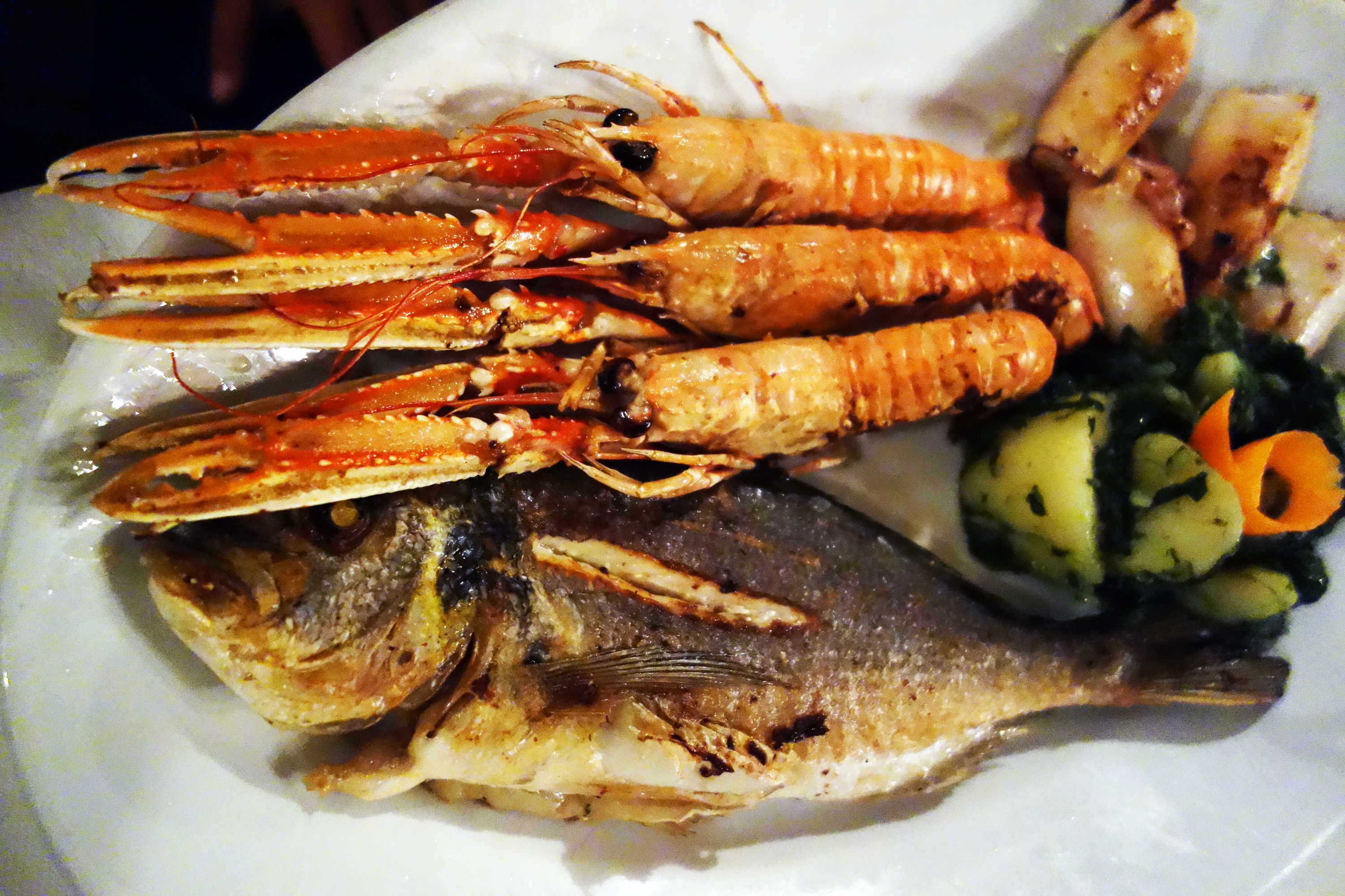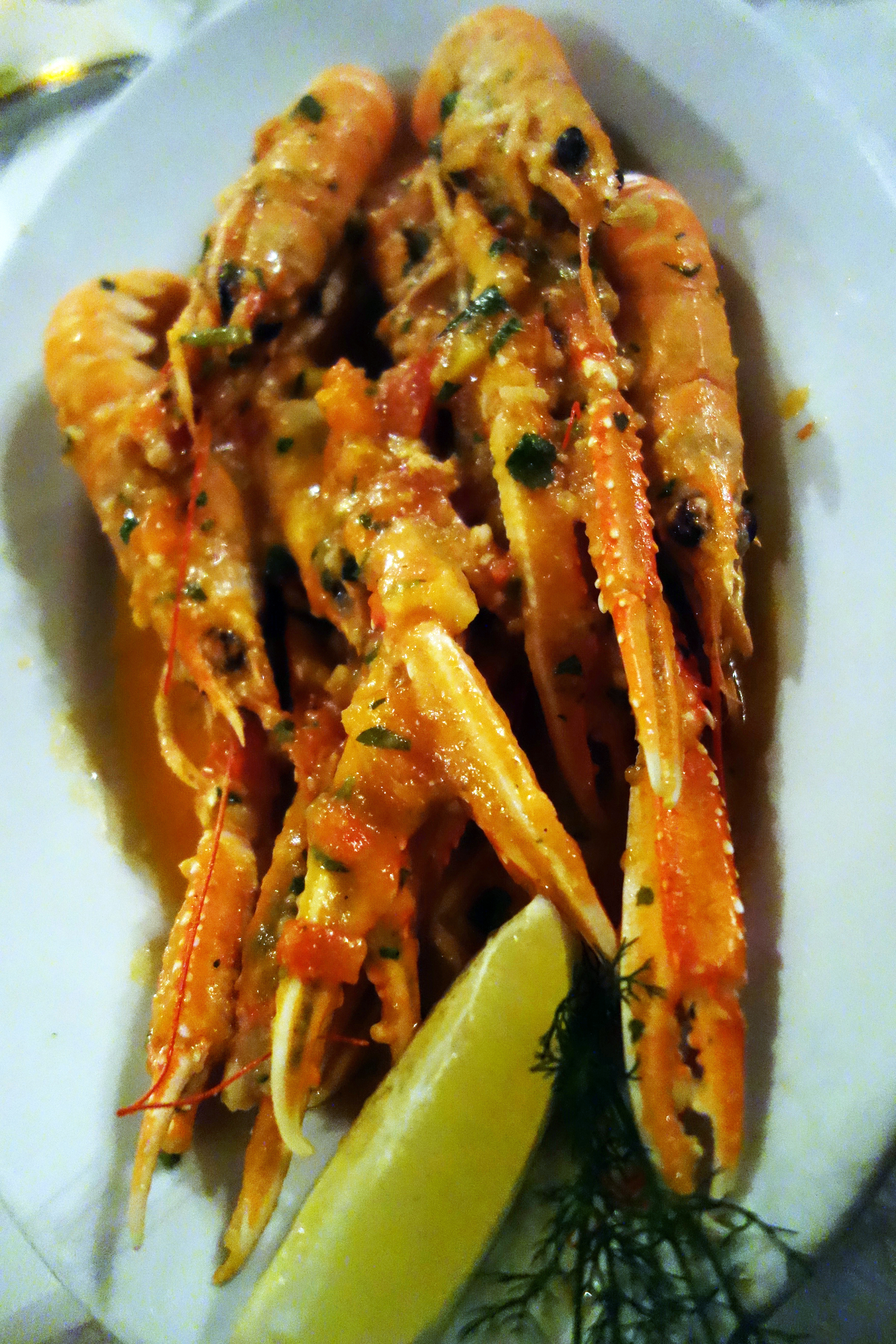 Scampi also appeared alla Busara, which means soaked in a sauce made with white wine and thickened with bread crumbs. This is a messy dish, fun to eat but frustrating at the same time. Pulling tiny bits of flesh out of claws and abdomen is strenuous work already. When sloppy, sticky sauce and sharp little bits of claw are involved it’s an even greater hassle. But there are two great joys that make this dish worth it – snapping the tail in half to pull the tail meat out whole and sucking the sauce seasoned brains out of the head. The sauce is great for sopping up with fluffy bread of which plenty is provided for this exact purpose.