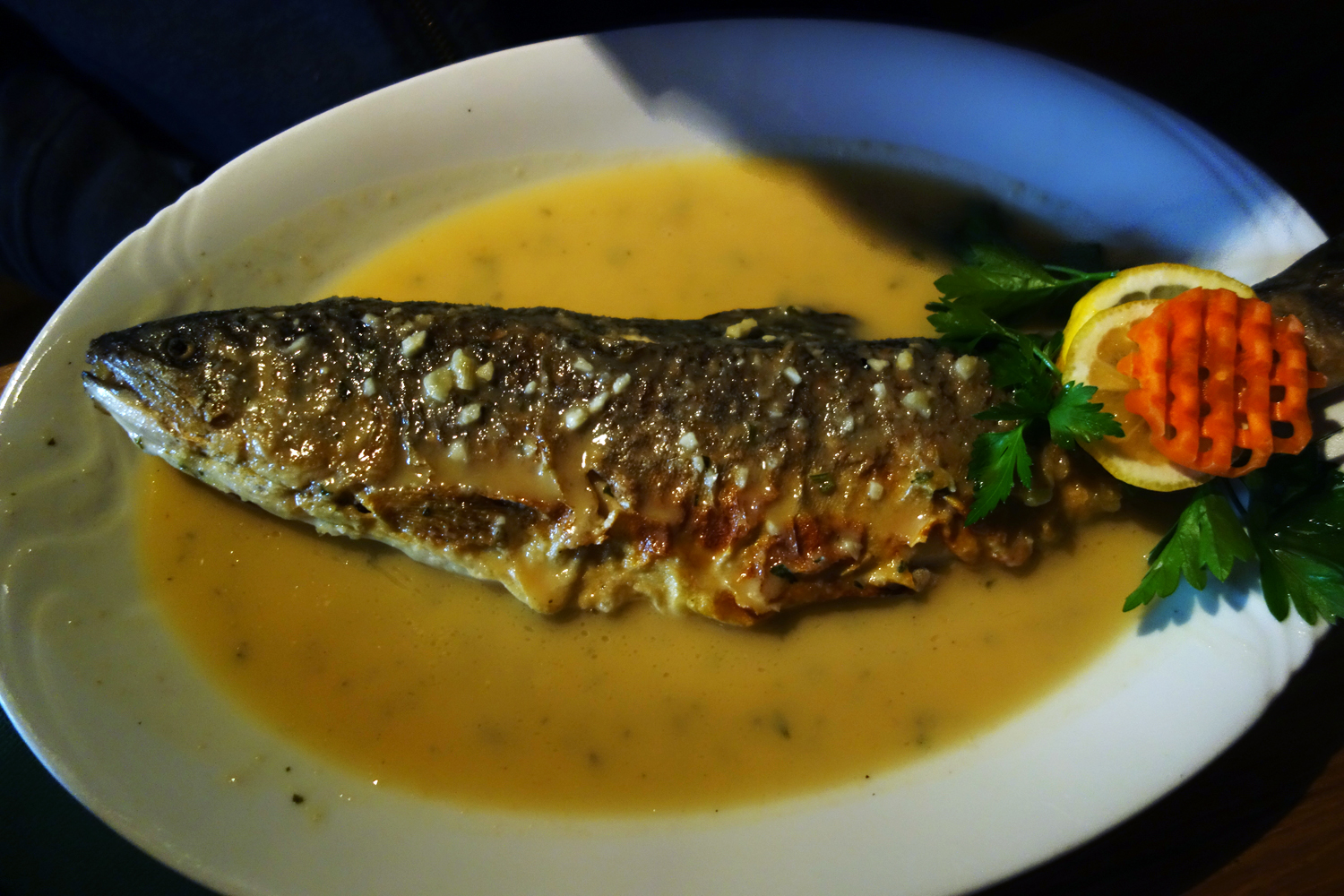 My brother chose the pan roasted trout in wine sauce, one of the four or five preparations on the menu of a fish very common to this area. The sucker was probably hooked and pulled out of the clear-as-glass water of Lake Bohinj in the valley below. As my brother sliced down the belly of the sucker, folding one half over the other and removing the spine whole, I could see bright white, slightly translucent flesh peeking forth from the browned skin. The thing was beautifully prepared, not a bit overcooked, and the meat remained slippery smooth. It had a very faint muddy flavor, a vestige of its lake dwelling past, which was checked with plenty of garlic, lemon and the wonderfully fragrant white wine butter sauce flavored also with marjoram and bay leaf. Plenty of fresh bread was provided in a basket on the side to sop up the precious sauce with.