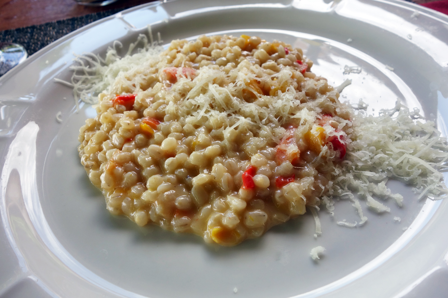 Also part of Menu 2 was a creamy stew of barley with bright red bits of pepper and plenty of fresh goat cheese both cooked into and shaved over the top. The little beads of grain had great texture. They were slightly chewy and firm, with the creamy cheese pulling the pieces together into a comforting mass, like tapioca pudding. The contrast between salty, sharp cheese and toasty, earthy barley kept the dish interesting despite it’s homogenous texture.