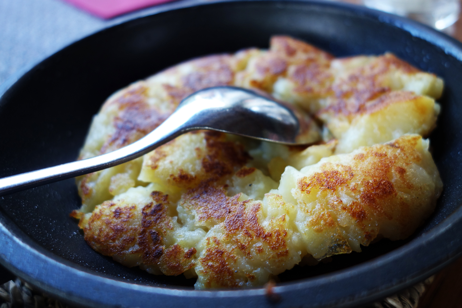 There was also a gratin of potato, which had been ground down to a chunky, loose puree and then toasted in a cast iron pan to achieve a gorgeous caramelized crust. We ended up sharing this as a communal side dish for all the different types of meat, and it worked out well. Scooping out a spoonful was a pleasure for the senses – the crack of the crunchy crust followed by the creamy, soft mash inside. And again the clean, green flavor of the olive oil used to pan–fry the thing was very much present and appreciated by all.