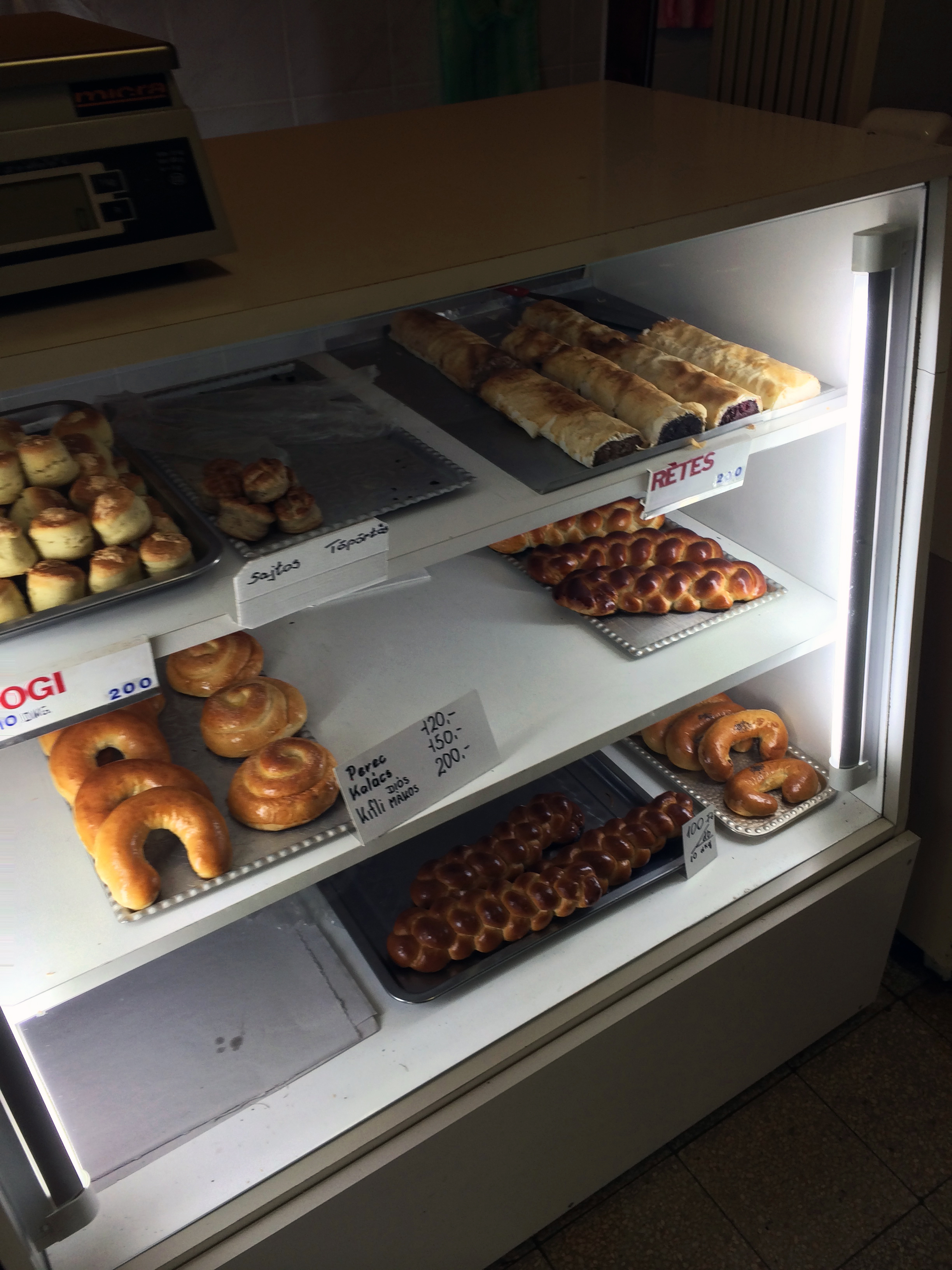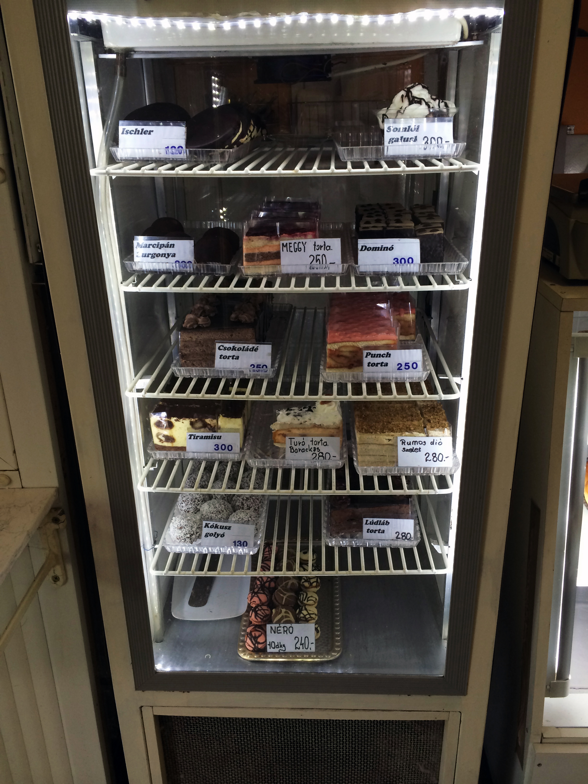 A strictly functional 20 year old pastry case stands by the counter, the shelves lined with the classics: Ischler cookies, Somlói galuska (a decadent trifle), cakes with quark cheese and peaches, chocolate, cherry, rum and walnut. There is also my favorite, the ethereally soft and mushy Coconut Ball, saturated with rum. In another case there’s rétes (strudel), some pogácsa (biscuits) and tightly braided loaves of challah. Not a huge variety but good ’nuff. I say “strictly functional” because I don’t think too many people come here for the pastries. It’s all about the ice cream at the néni’s place.