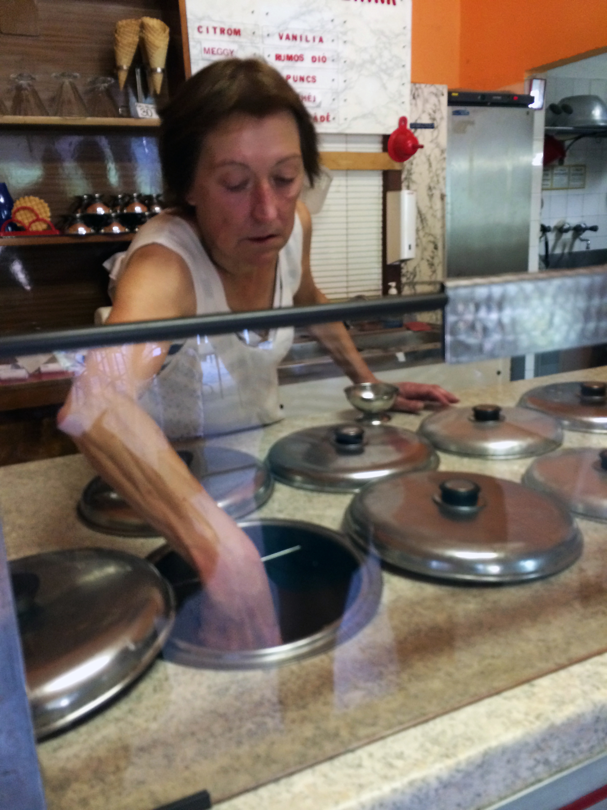 The cafe is one that seems to have not changed in decades. Time has stopped here. The néni herself seems like a person from another era, a tougher one. She’s a stern, somewhat grim looking character who seems hardened by the passage of time. Her stare is blank and indifferent, her posture completely deflated. She doesn’t express any emotion at all; not until the very last minute, when she abruptly casts a warm smile on my darling little niece. She follows up by crooning something in a gentle yet pedagogical tone, maybe “Good little girls wait for their ice cream patiently.” Or something like that.