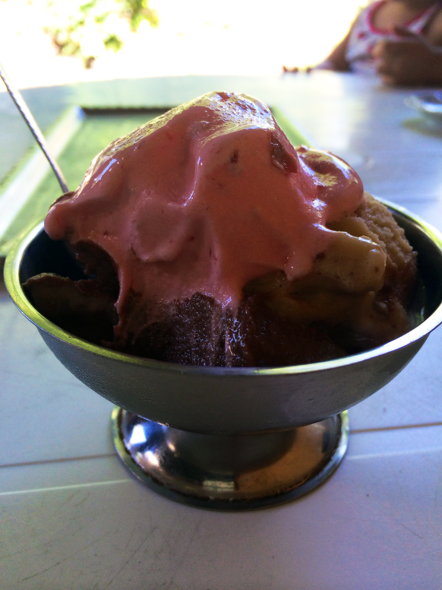 The ice cream was not the best I’ve ever had, nor was it even one of the best. It was actually not that great at all. To me the sour cherry was too sweet and the walnut overwhelmed by rum. The icy grit on the surface melted rapidly, causing almost every bite to feel watery on the tongue. The chocolate above all screamed for cream desperately, refusing to surrender to its fate but melting, inevitably, along with the rest. Scraping off the liquid wasn’t so bad on a hot summer day and I guess digging straight into the core would have yielded firmer spoonfuls. But the ice cream needed too much supervision and care for it not to become a puddle before the very first bite. It wasn’t something to hang out with for a while, but I guess sitting around slowly slurping your frozen treat is a bourgeois luxury that wasn’t as common back when this type was popular. Nevertheless I was wishing for something denser and sturdier by the end. I was craving the artisanal gelato back in Budapest.