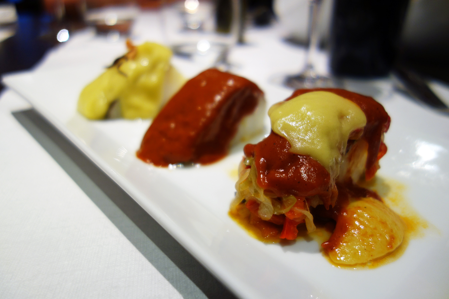 The most traditional Basque dish, from what I could tell, was the Cod Sampler – three pieces of salt cod, each served with a typical sauce. The first was Pil-Pil, a very thick yellow sauce made by whipping up an emulsion from the oil the fish was sauteed in. The sauce maintained some of the flavors of the fish and had a hint of garlic as well, but to me the texture was a tad too heavy and unnaturally gelatinous. There was also maybe too much of it. The Pil-Pil seemed to suffocate the tender, flaky fish underneath. Not my favorite. The Vizcaina sauce suited me better. It was a thick, bright red sauce made with sauteed garlic, onion and pepper with some of the cod’s poaching liquid (along with all that jiggly fish fat) stirred in. The flavors were those of mature, caramelized veggies and fish; the sauce formed a snug little blanket for the cod underneath. The best of the three was the cod with Club Ranero Sauce, which I believe was basically the same as the Vizcaina but with sauteed onions and peppers also lain between sauce and cod. Good textural contrast from the veggies and a gorgeous natural dulzor to round out the flavors.