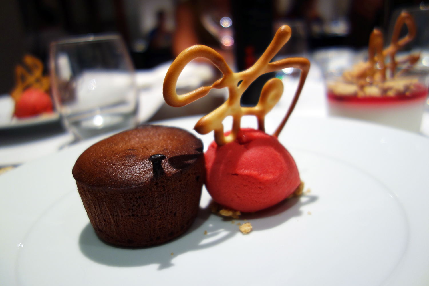 There was also a warm fondant bleeding forth smooth dark chocolate when broken into. It was paired with a brilliantly acidic and refreshing sorbet of raspberry, which balanced the bitterness of the chocolate beautifully. Again, not particularly Basque but a classic very well executed. As is the case with all of Gorka’s desserts, this one was marked with the restaurant’s signature, in the form of a crunchy cookie.