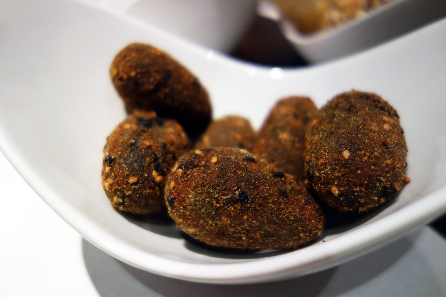 The best dish of the night by far was the bowl of Black Squid Croquettes that we ordered to share but which my uncle and I ate the most of… with our eyes closed, humming. Do I doubt that Basque grandmas whip up this kind of thing for Sunday’s family gatherings? Yes. Do I care? Absolutely not, in this case. The croquettes were nothing short of explosive in flavor. The crunch of a heavenly, golden brown crust yielded a thick pudding of squid ink, which gushed forth and coated the mouth in a viscous glaze of pure squid ink flavor. It had that murky, musky low-tide brine, that barnacle juice funk and subtle sweetness that I love so much. And it was jet black in color. The blood sausage of the sea. Contrasting in flavor, texture and color was the gorgeous bread crumb crust whose grainy, sandy consistency was elevated masterfully with the addition of white and black sesame seeds. The latter caramelized from the heat of the deep-fryer and exuded a toasty, nutty flavor that harmonized maddeningly well with the sweetness and brine of the ink. This dish, though one of the simplest, was the perfect appetizer. It 100% made up for those dishes I didn’t like quite as much.