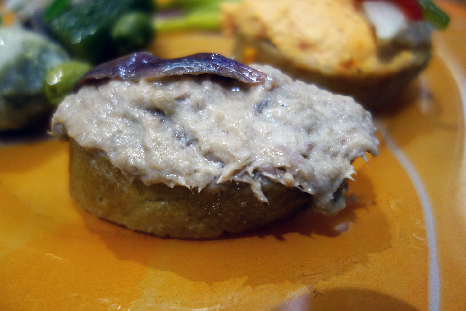 Attacking the pickle station, I had an artichoke heart stuffed with chopped peppers and onions, which I unfortunately didn’t get a very good shot of. Bartolo seems to specialize in pickled artichoke hearts. I saw some wrapped in ham or bacon and others garnished with a variety of other pickled veggies. Additionally I tried the pickled gherkin stuffed with tuna and garnished with minced onion and olives. The pickles were wonderful here, sweet and sour with the perfect snap in texture. I enjoyed the combination of the pickle with the fish, though the texture of the latter was a bit too stiff for me. I would’ve preferred it to flake a bit more.