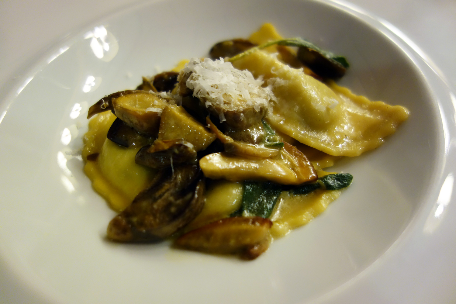 The only dish of the night which didn’t particularly wow me was the ravioli of chanterelle mushrooms wetted with a cheese sauce. The folded edges of ravioli were a bit too chewy and the mushroom filling inside was bland in flavor. The sauteed mushrooms around the pasta were fine, though nothing too spectacular and the cheese sauce could have been a tad more pungent to keep up with the rest of the dish. What was, however, quite memorable about this dish was the sage leaf that burst forth intense woodsy notes as well as mild citric ones when I scraped its surface with my knife. It imparted a wonderful aroma to the entire dish, making it a pleasure to breathe in.